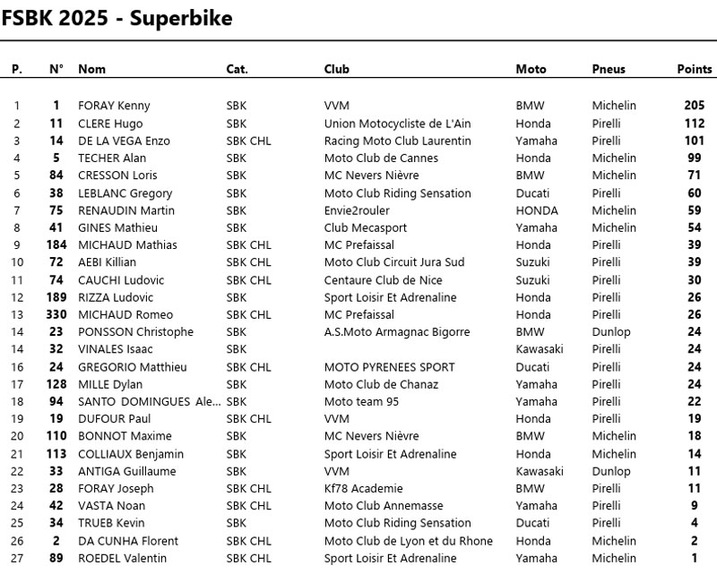 Près de 200 pilotes, répartis en 7 catégories, qui donnent lieu à 14 courses par week-end sur 7 des plus beaux circuits de l’Hexagone… Voilà ce qu’est le FSBK ! Une compétition intense et imprévisible où le pilote et sa machine défient les lois de la physique à chaque virage, offrant un spectacle captivant aux fans de la discipline.