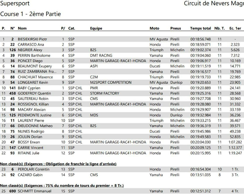 Alors que PEROLARI semblait filer vers un succès incontestable avec plus de 18 secondes d’avance, un coup de théâtre vient bouleverser le classement dans le dernier tour : une panne mécanique le contraint à l’abandon. BIESIEKIRSKI hérite ainsi de la victoire, devant CARRASCO, 2e, et NEGRIER, qui complète le podium après une course solide. PERRIN sauve une 4e place méritoire, devant PONCET 5e et Exupery BEAUMONT (Ducati Team ASPI – Michelin), 6e.