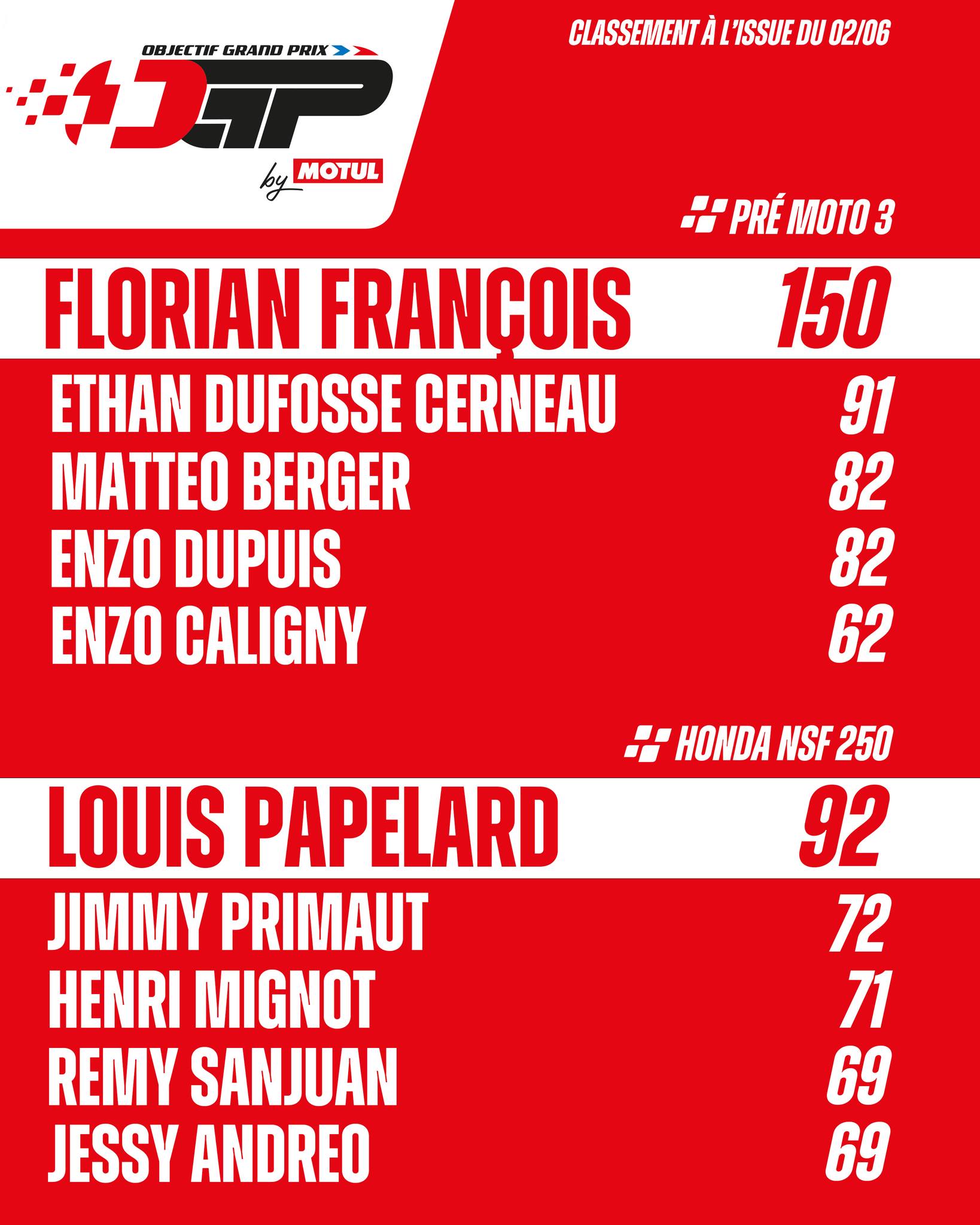 Dans le programme Génération Vitesse, la catégorie Objectif Grand Prix présentée par Motul n’est pas en reste. En Pre-Moto 3, Florian FRANÇOIS (BEON – Pirelli) assoit sa suprématie avec pas moins de 59 points d’avances sur son premier poursuivant Ethan DUFOSSE CERNEAU (BEON – Pirelli), en constante progression. Du côté de la catégorie NSF 250, Louis PAPLARD (Honda – Pirelli) est toujours solide leader mais poursuivi par un petit groupe de pilotes déterminés. Jimmy PRIMAUT (Honda – Pirelli), second au classement ou encore Henri MIGNOT (Honda – Pirelli), vice-champion l’année passée.