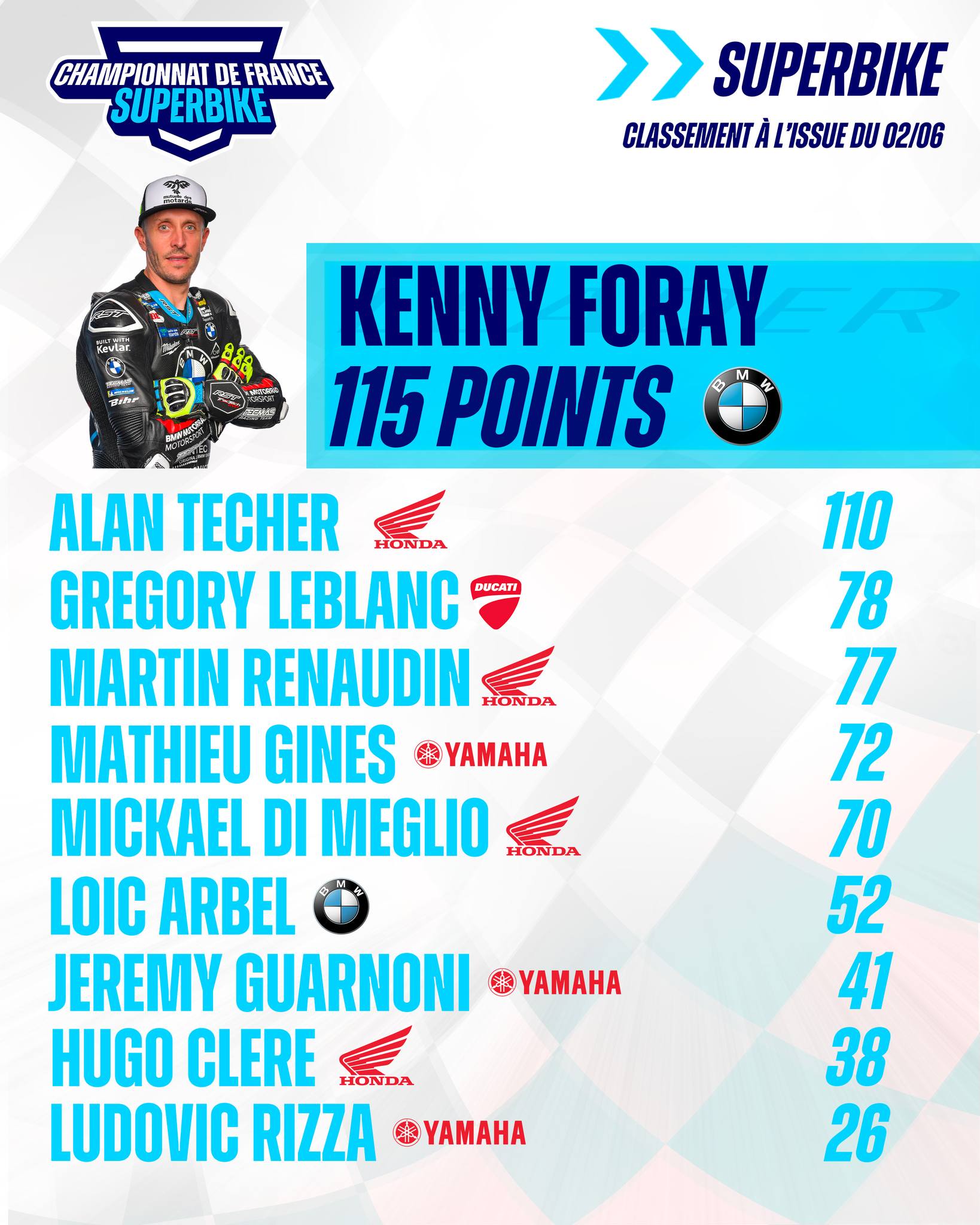 À l’issue de la dernière étape deux pilotes se sont illustrés en offrant aux fans une bataille digne du plus haut niveau de la vitesse française que représente la catégorie reine. Il s’agit de Kenny FORAY (BMW Tecmas – Michelin), leader du Championnat pour deux points et d’Alan TECHER (Honda Team CBO Racing France – Michelin), son dauphin. Les deux hommes bataillent depuis le lancement de la saison et se sont détachés des autres concurrents. À l’approche de cette étape de mi-saison, leurs premiers poursuivants se nomment Grégory LEBLANC (Ducati TWR – Pirelli), 3ème, Martin RENAUDIN (Honda Moto&GP Addict – Michelin), 4ème, ou encore Mathieu GINES (Yamaha 41 Performance – Michelin), 5ème. Le vice-champion de France, Mike DI MEGLIO (Honda Team CBO Racing France – Michelin), est quant à lui relégué à la 6ème place du provisoire après une lourde chute à Nogaro l’ayant tenu écarté des circuits durant plusieurs semaines. Son éventuel retour en piste devrait rebattre les cartes et serait donc une excellente nouvelle pour le suspens et le spectacle.