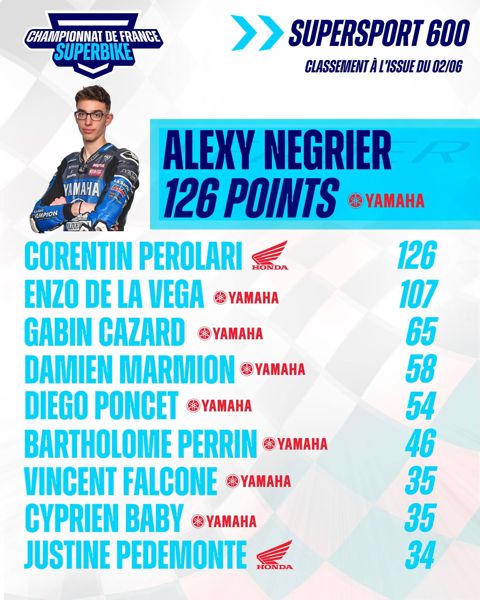 La situation dans la catégorie des 600cc a grandement évolué lors de la dernière étape dans le Gers. Si Alexy NEGRIER (Yamaha – Michelin) avait dominé un début de saison pluvieux, il s’est vu rattrapé par certains des favoris au titre comme Corentin PEROLARI (Honda – Michelin) et Enzo DE LA VEGA (Yamaha – Pirelli) qui espèrent désormais reprendre les commandes pour se rapprocher de leur objectif : le titre de Champion de France. En ce qui concerne les machines de la nouvelle génération, un trio de tête fait sensation. Il s’agit de Guillaume ANTIGA (Ducati – Michelin), solide leader mais challengé par Hugo DE CANCELLIS (Ducati – Pirelli), second et le jeune Matthieu GREGORIO (Ducati – Pirelli), 3ème au classement.