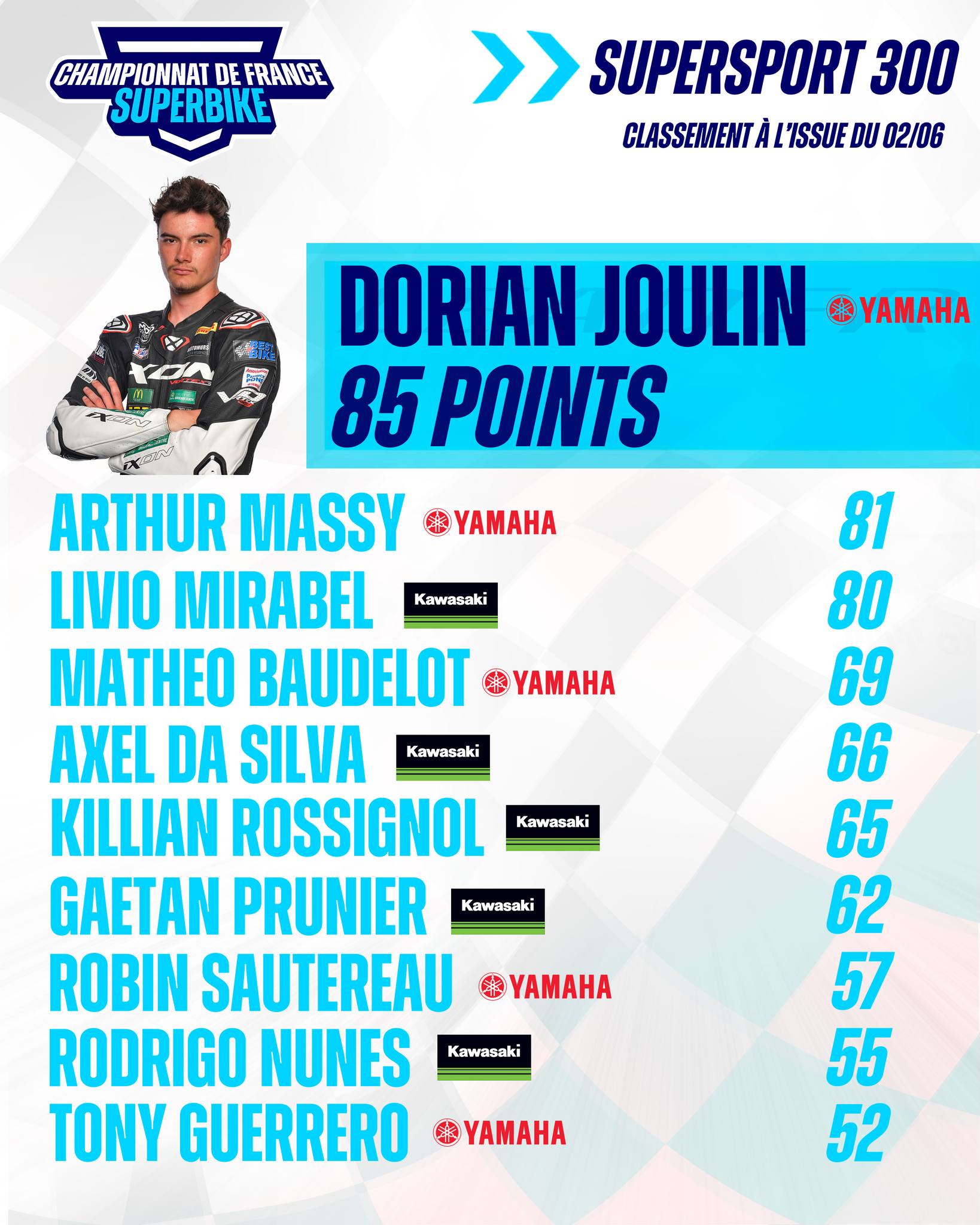 La catégorie 300 est elle très partagée. Trois jeunes pilotes se tiennent dans un mouchoir de poche : Dorian JOULIN (Yamaha – Pirelli), leader avec 85 points devance Arthur MASSY (Yamaha – Pirelli), second avec 81 points et Livio MIRABEL (Kawasaki – Pirelli), 3ème possède quant à lui 80 points. Ces faibles écarts annoncent un spectacle haletant dans la Nièvre.