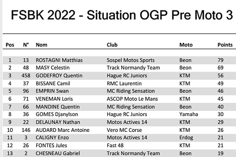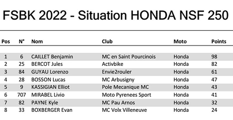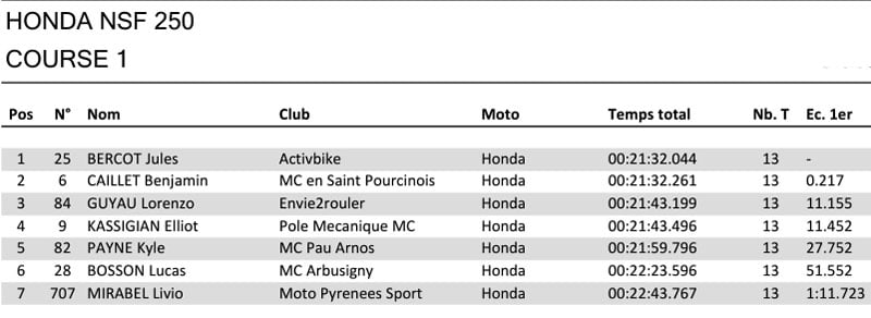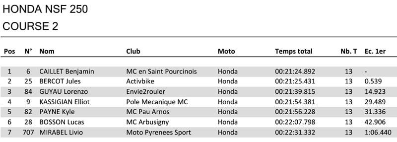 Grâce à la réaccélération de sa machine, le leader du championnat CAILLET prend un avantage décisif au drapeau à damier et par conséquent sa revanche devant BERCOT. Lorenzo GUYAU complète le podium à plus de 14 secondes des deux autres et Eliott KASSIGIAN (Honda NSF) termine 4ème tout comme il l’avait fait en course 1.