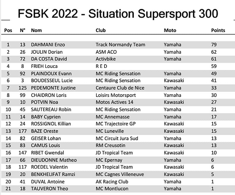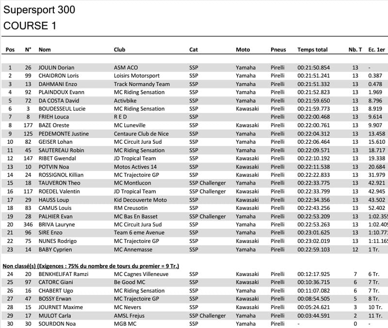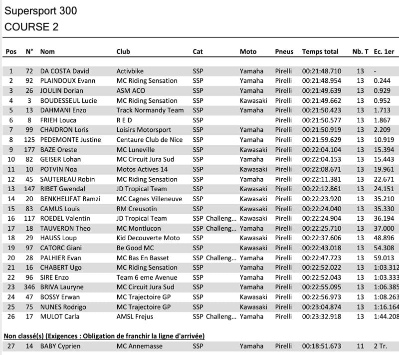 À l’arrivée, DA COSTA est le plus heureux en décrochant sa première victoire en Supersport 300 devant PLAINDOUX, 2ème. La joie du vainqueur contraste avec la déception de BOUDESSEUL qui se fait subtiliser la 3ème place par JOULIN sur le drapeau à damier après avoir été la grande artisane de cette course magnifique. DAHMANI conserve quant à lui la 5ème position, son moins bon résultat de la saison, devant FRIEH, 6ème, et CHAIDRON, 7ème.