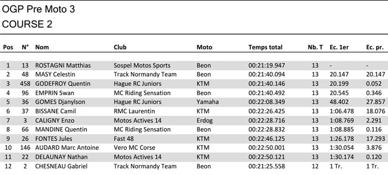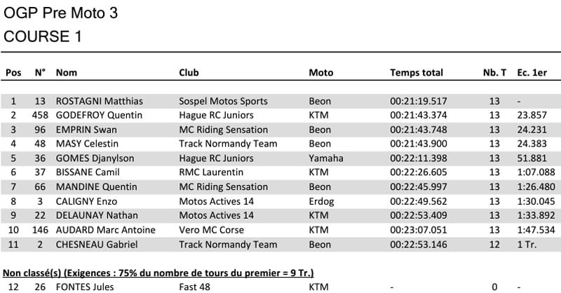 À l’instar de ce qu’il avait réalisé au Mans en course 1, Matthias ROSTAGNI (Béon) impose son rythme dès les 1ers tours et aucun de ses adversaires n’est en mesure de prendre sa roue. Quentin GODEFROY (KTM ), Swan EMPRIN (Béon) et Célestin MASY (Béon) entament tout de même la lutte pour les deux autres marches du podium.