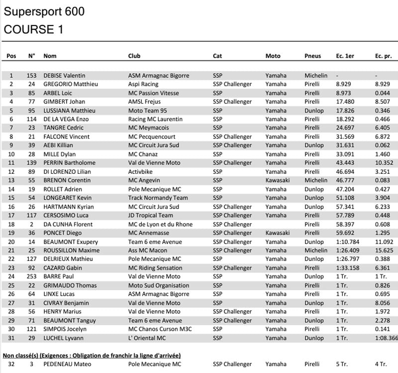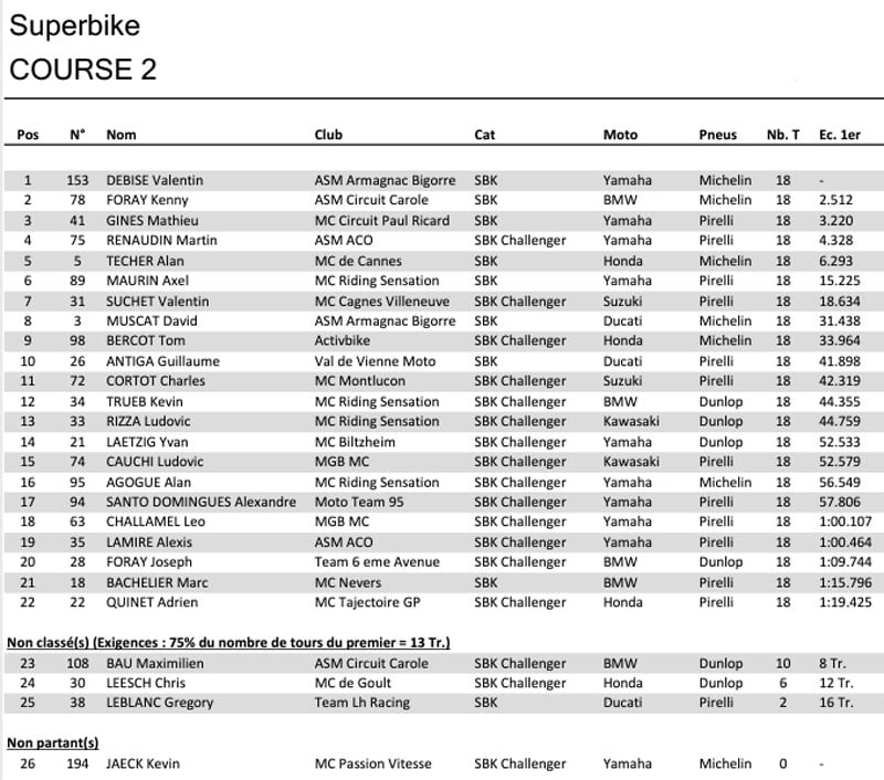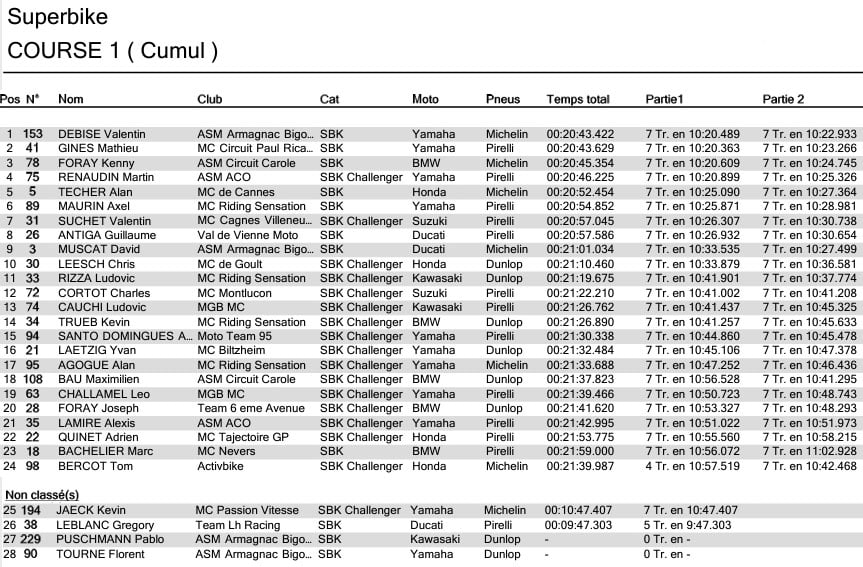 Axel MAURIN (Yamaha CMS – Pirelli), passe donc 6ème, après avoir fait l’effort pour contenir la Ducati n°26 de Guillaume ANTIGA (Ducati – Pirelli) qui prend la 8ème place au cumul des deux parties de course. Le Challenger Valentin SUCHET, est quant à lui 7ème au cumul et monte sur la deuxième marche du podium de sa catégorie, complété par le luxembourgeois Chris LEESCH (Honda – Dunlop) qui ferme le top 10 au scratch.