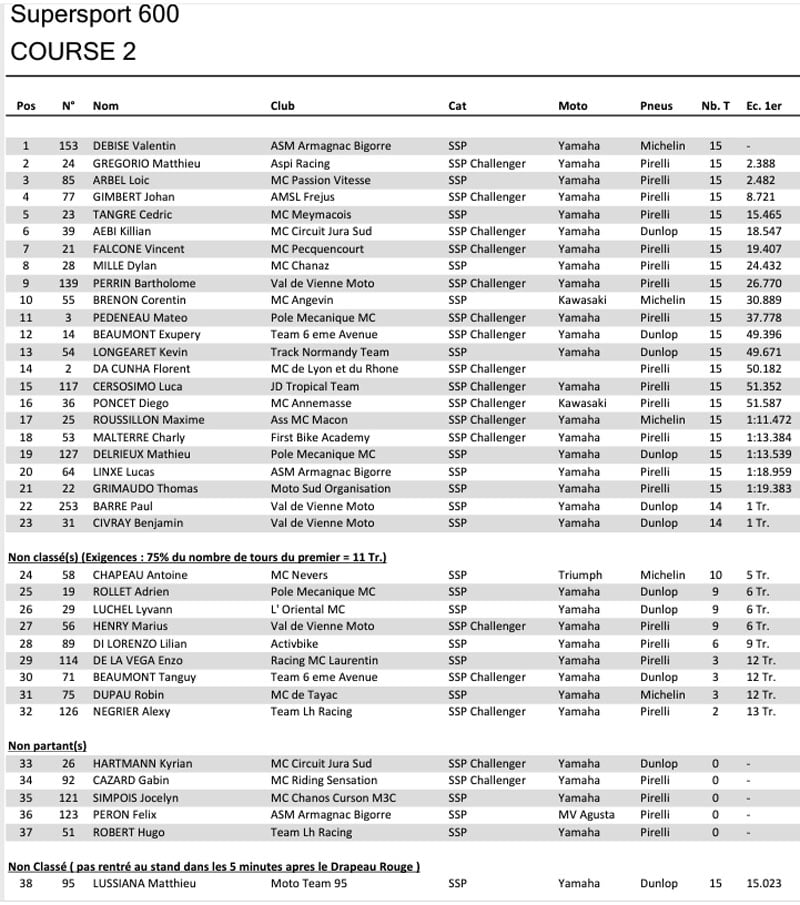 À la mi-course, les attaques successives que se portent mutuellement ARBEL et GIMBERT profitent à DEBISE qui s’échappe et consolide peu à peu son avance. En embuscade au 4ème rang, GREGORIO fait l’effort pour rester au contact des Yamaha n°85 et n°77. Derrière ces 4 hommes, le public assiste à une belle bataille pour la 5ème place entre 3 pilotes d’expérience : Matthieu LUSSIANA (Yamaha – Dunlop), Cédric TANGRE (Yamaha – Pirelli) et Enzo DE LA VEGA (Yamaha – Pirelli).