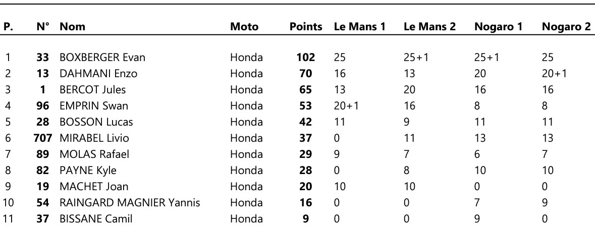 Evan BOXBERGER (Honda – Bridgestone) prend une nouvelle fois le meilleur des départs et parvient assez rapidement à distancer ses principaux concurrents Jules BERCOT (Honda – Bridgestone), 2ème, et Enzo DAHMANI (Honda – Bridgestone), 3ème.