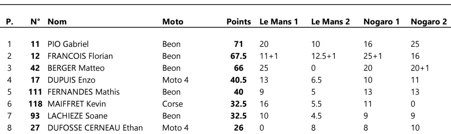 À l’arrivée, BABY parachève son cavalier seul en s’adjugeant la victoire. De son côté, PEDEMONTE se montre autoritaire et décroche la 2ème place de justesse devant le leader du Championnat CHAUVEAU, 3ème, et NUNES MENDES est alors au pied du podium. La lutte pour le top 5 tourne à l’avantage de ROSSIGNOL qui devance DELBOSC, 6ème, et PRUNIER, 7ème.