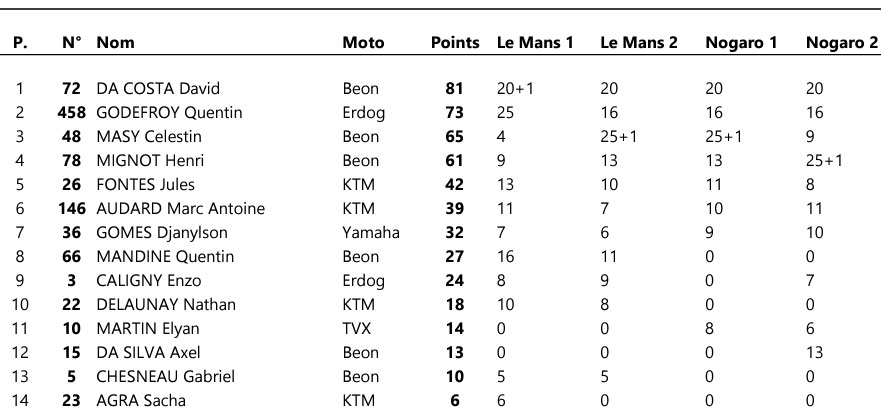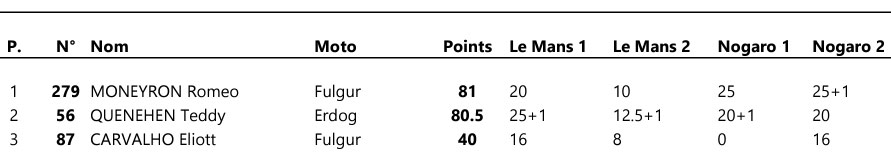 Chez les plus jeunes pilotes de la catégorie, Bartholomé PERRIN s’impose donc devant Alexy NEGRIER (Yamaha-Pirelli), 10ème au scratch et Gabin CAZARD (Yamaha – Pirelli), 11ème.
