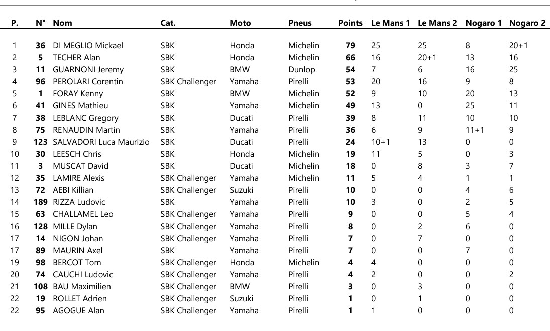 Moins de 4 secondes derrière, Grégory LEBLANC (Ducati TWR – Pirelli) se classe 6ème, devant le vainqueur de la catégorie Challenger, Corentin PEROLARI (Yamaha Moto Ain – Pirelli), 7ème au scratch. Après une petite chute sans gravité dans le 13ème tour, Di MEGLIO se relance et ne conclut qu’au 8ème rang. Discret depuis le début du week-end, Axel MAURIN (Yamaha CMS – Pirelli) est 9ème devant Dylan MILLE (Yamaha – Pirelli) qui clôture le top 10 et s’offre la 2ème place de la catégorie Challenger, Léo CHALLAMEL (Yamaha – Pirelli), 11ème, complète le podium.