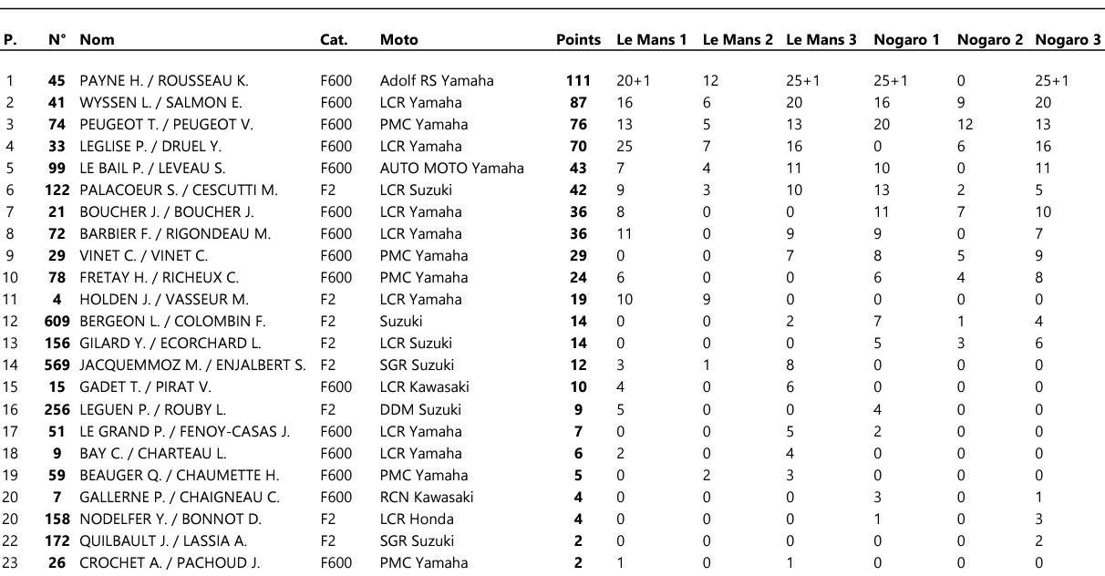À l’arrivée, PAYNE / ROUSSEAU remporte haut la main sa seconde course de la saison, suivi de loin par PEUGEOT / PEUGEOT qui doit nourrir des regrets de ne pas avoir pu lutter pour la victoire. À la 3ème place WISSEN / SALMON vient compléter le podium de cette première d’un week-end qui en comptera trois pour les side-caristes. PALCOEUR / CESCUTTI, meilleur de la catégorie F2 termine au pied de la boite, devant BOUCHER / BOUCHER 5ème et LE BAIL / LE VEAU, 6ème.
