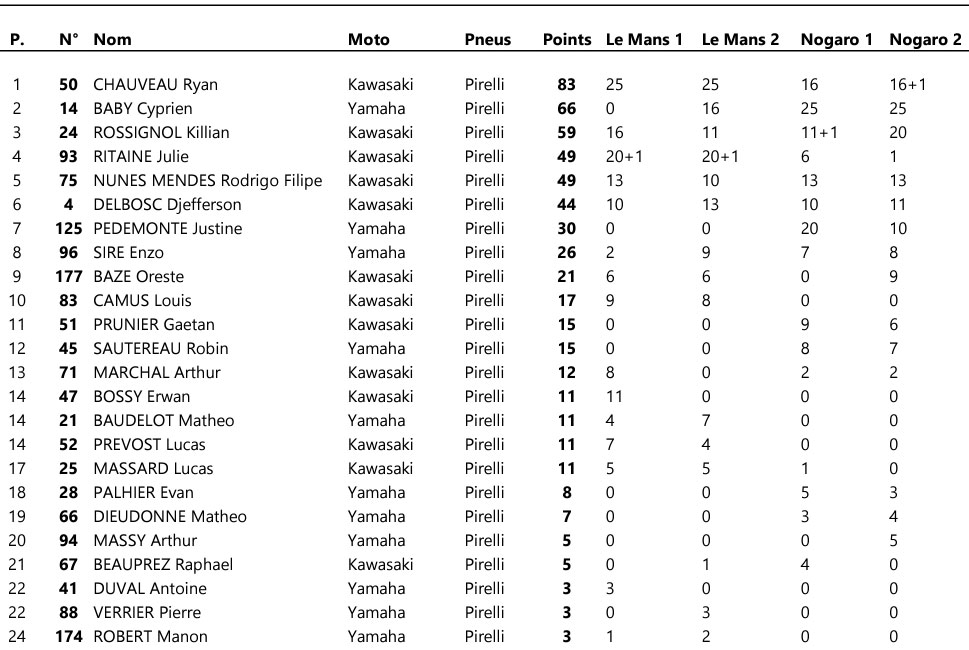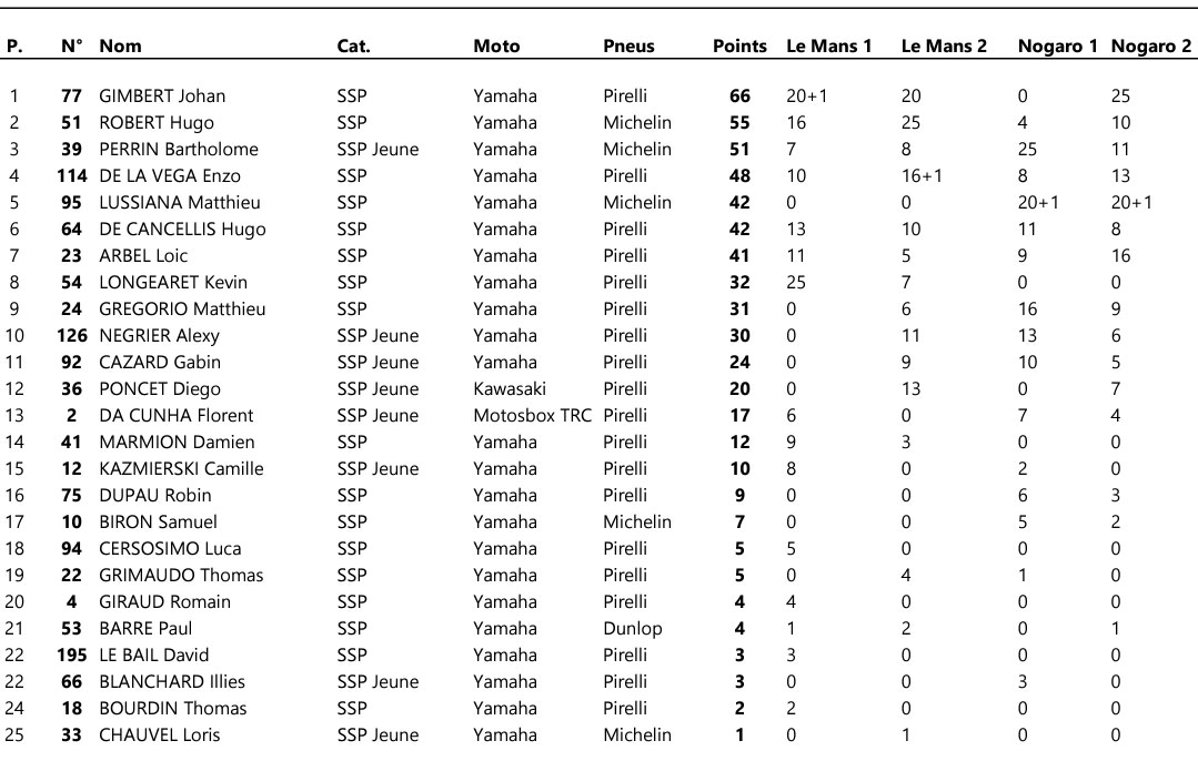 Dans les derniers tours, GIMBERT rehausse le rythme pour se mettre à l’abri de LUSSIANA et s’assure la victoire après avoir laissé échapper de nombreux points en course 1. Pour LUSSIANA c’est une nouvelle 2ème place devant ARBEL qui remonte sur le podium après une longue période ponctuée de blessures. Au pied de la boite, le public de Nogaro retrouve la Yamaha de De La VEGA précédant celle de PERRIN, 5ème et victorieux en catégorie Challenger. Après une fin de course impressionnante, Hugo ROBERT (Yamaha – Pirelli) surprend Matthieu GREGORIO et Hugo DE CANCELLIS, qu’il relègue aux 7ème et 8ème rangs.