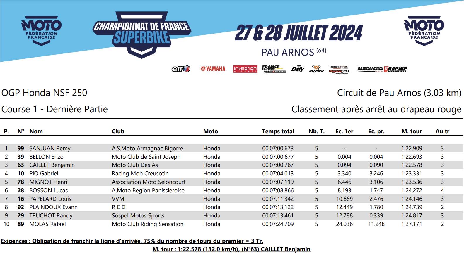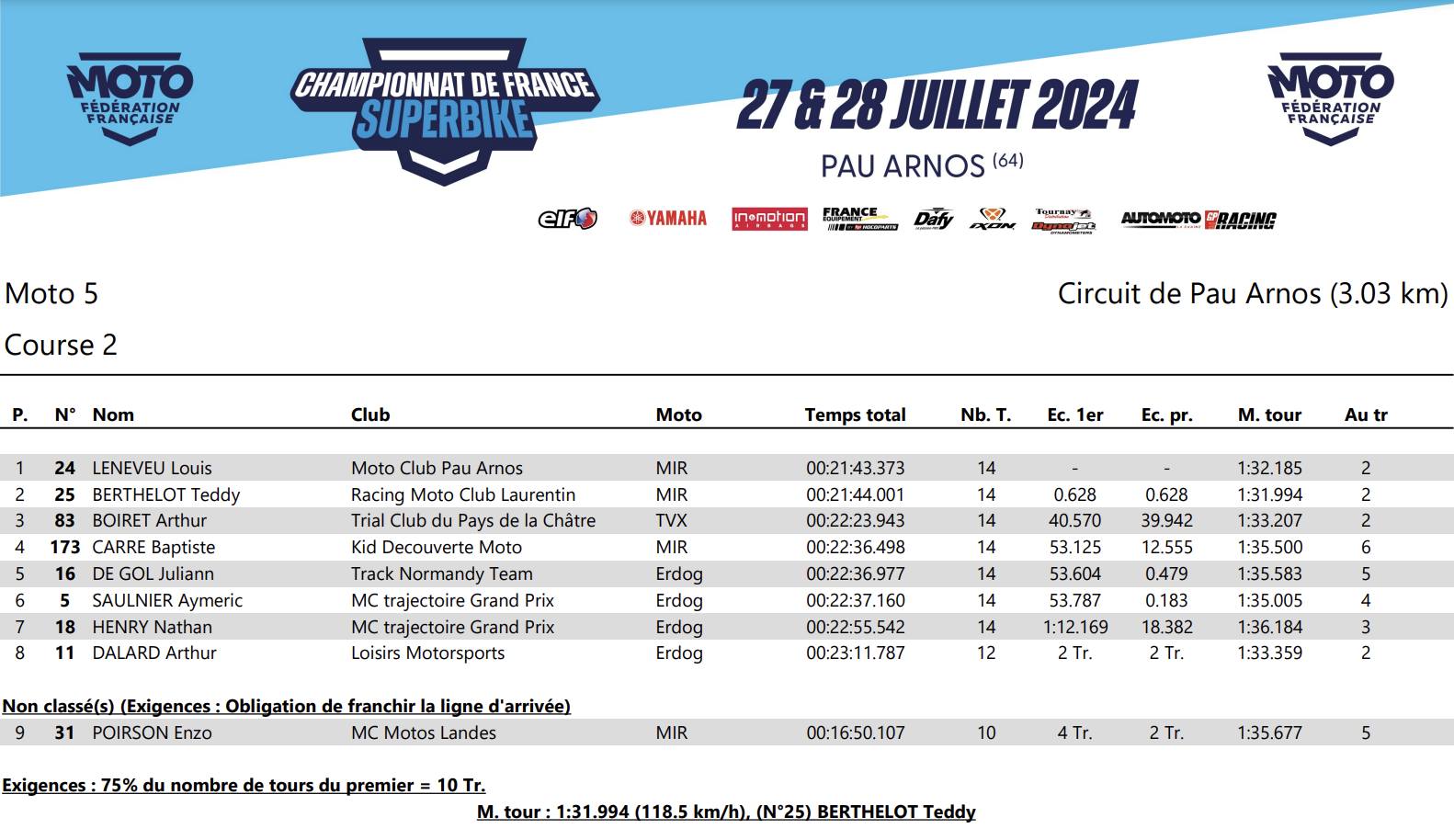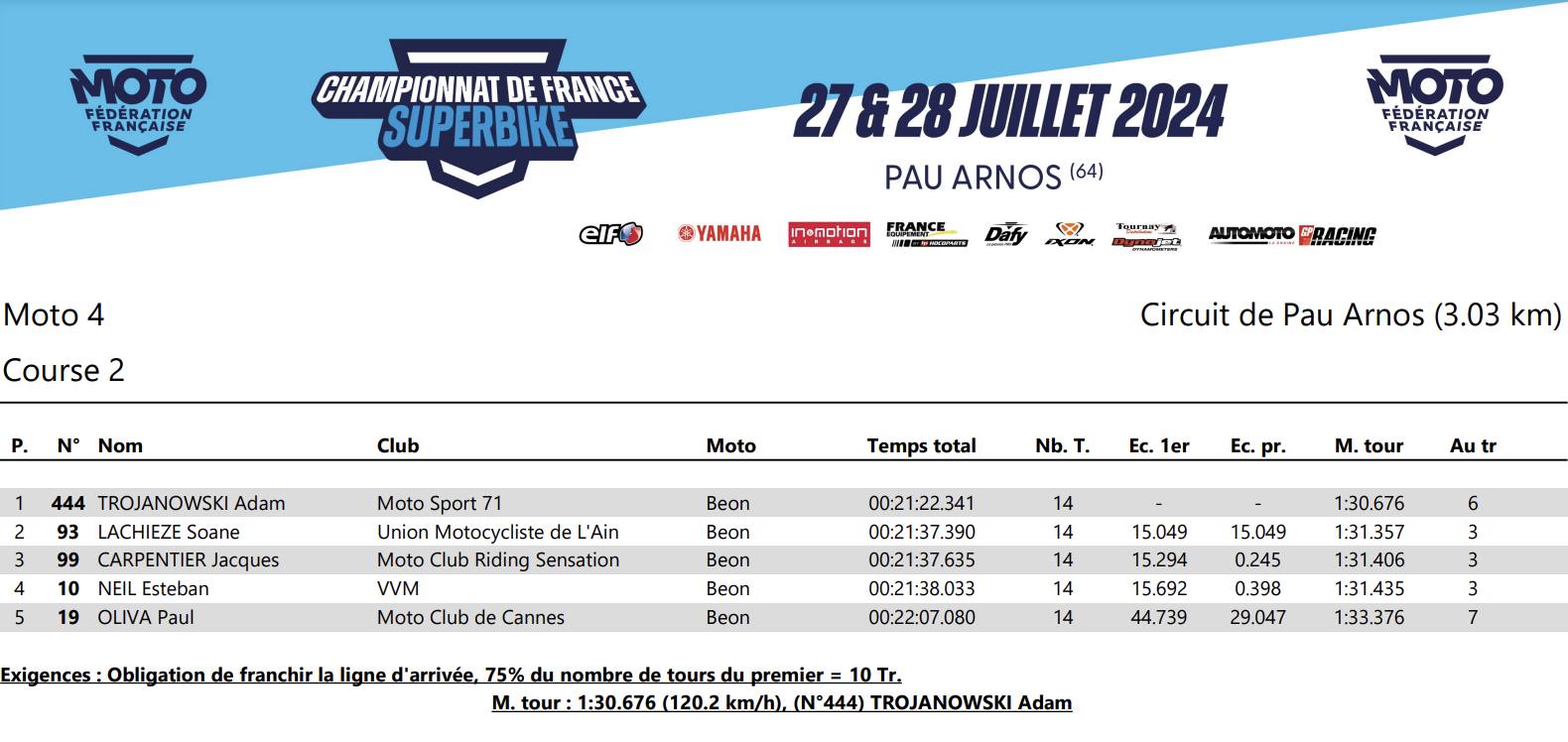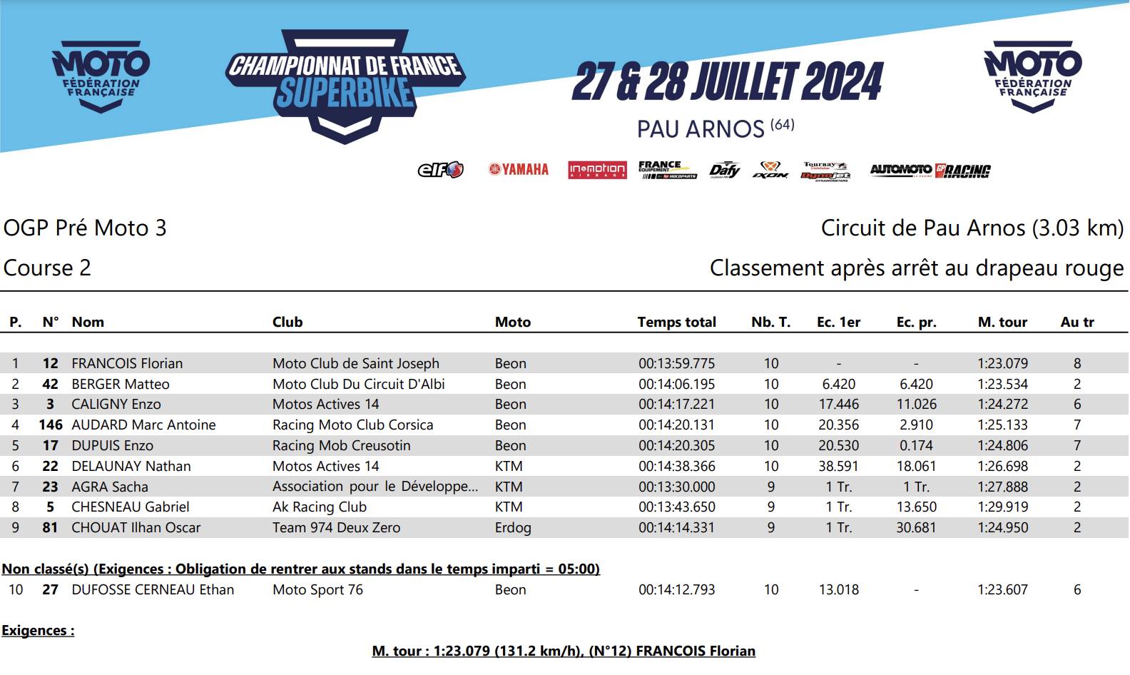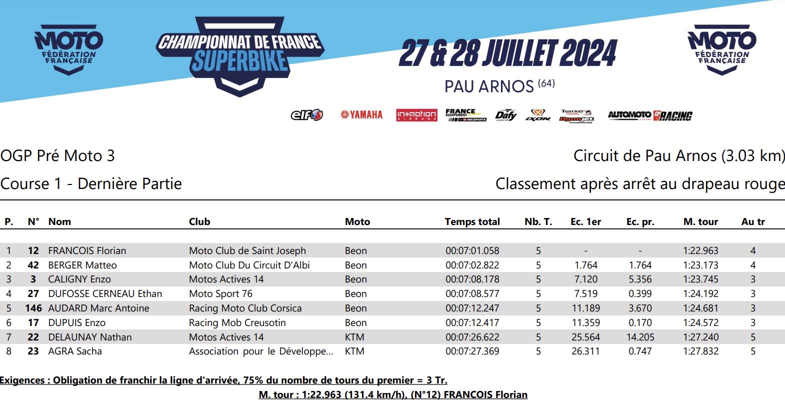 Florian FRANÇOIS s’impose haut la main et accentue son avance au championnat sur son dauphin. Il s’agit de Matteo BERGER, second qui devance Enzo CALIGNY, 3ème après la chute de son  prédécesseur.
