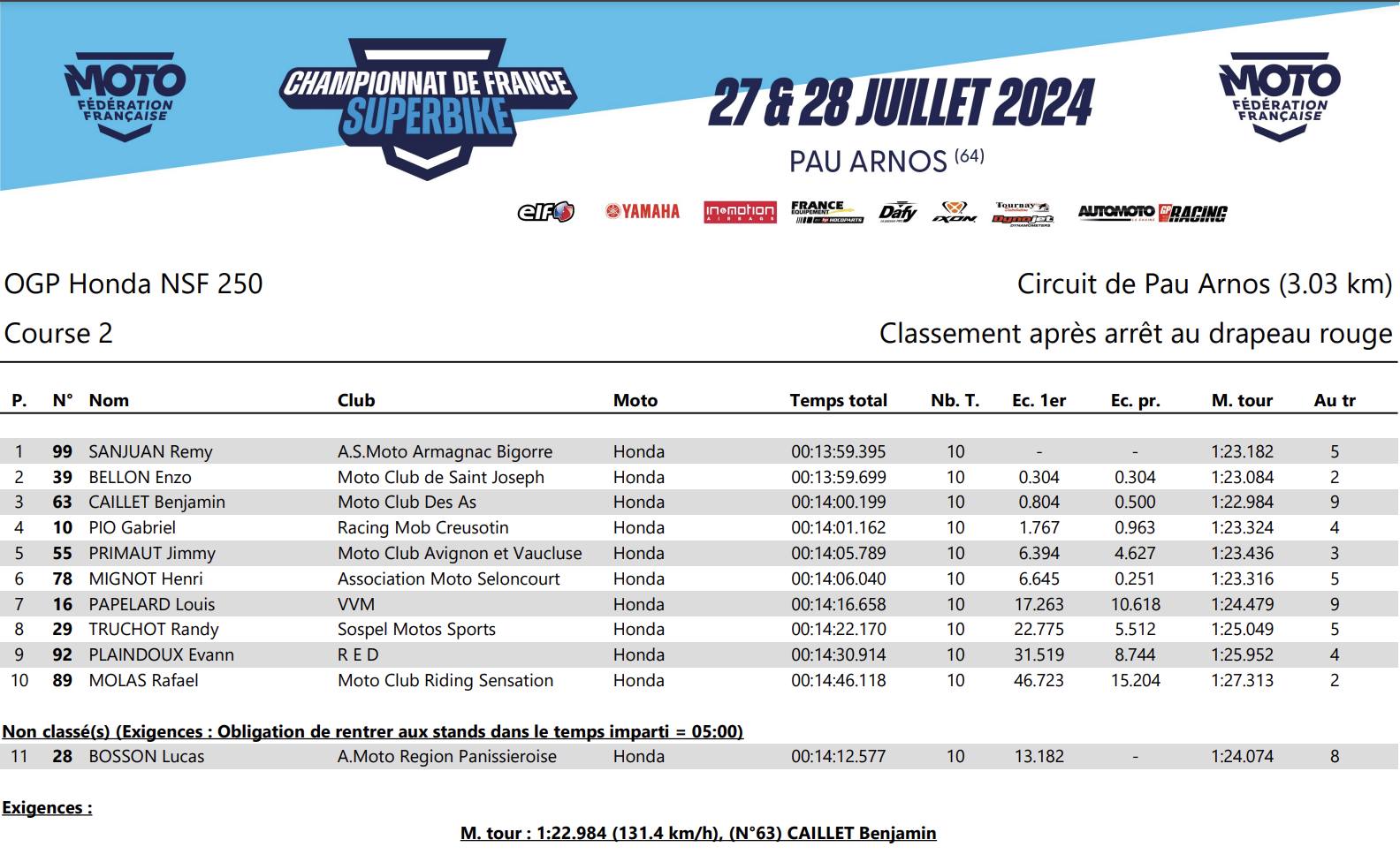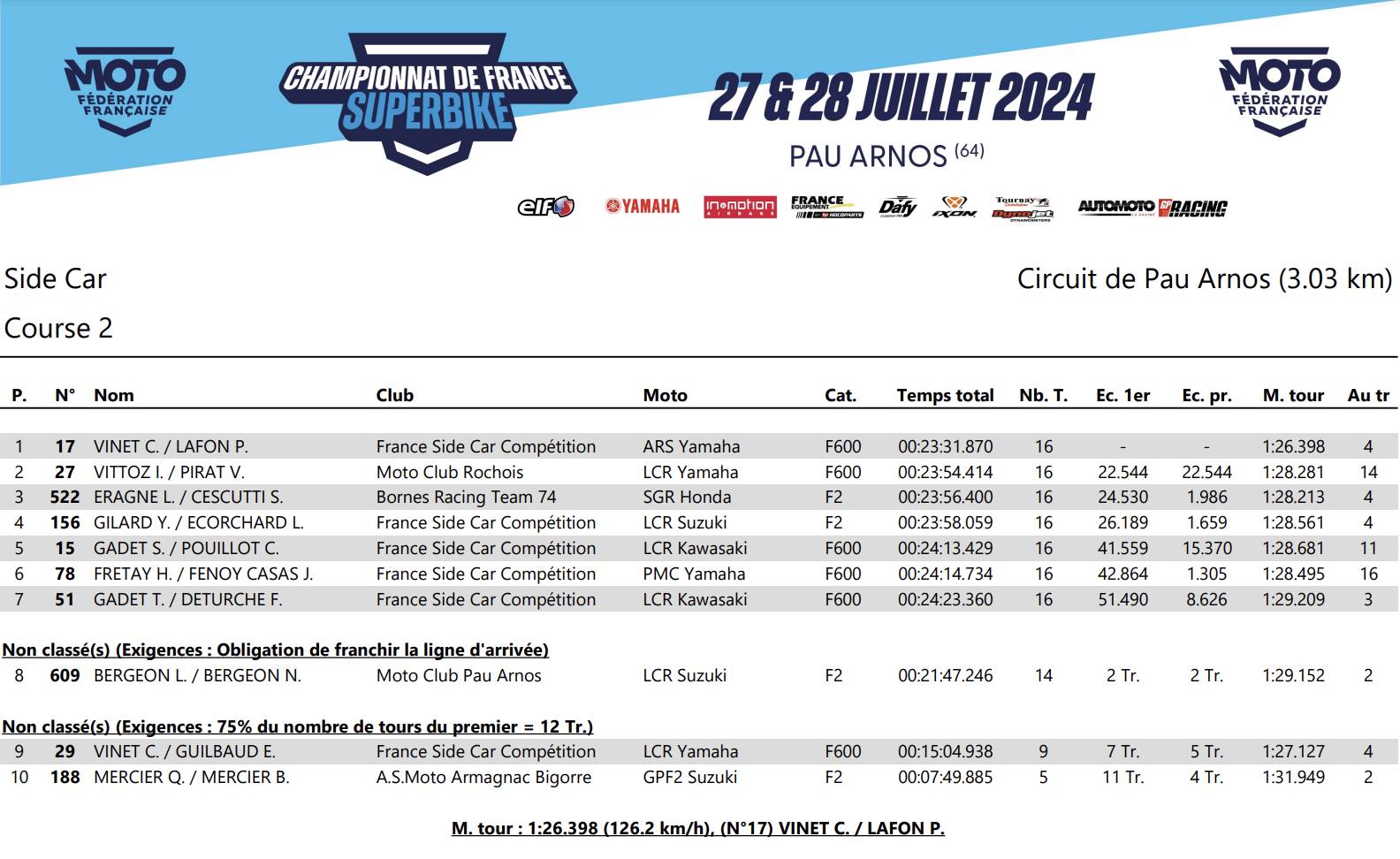 Au passage de la ligne, pas de surprise. VINET / LAFON remporte sa deuxième course du week-end. Il devance VITTOZ / PIRAT, second et ERAGNE / CESCUTTI, 3ème qui a bénéficient de l’abandon de  VINET / GUILBAUD. Derrière, GILARD / ECORCHARD (F2) est 4ème et GADET / POUILLOT (F600) complète le top 5. Enfin, FRETAY / FENOY CASAS (F600), est 6ème et GADET / DETRUCHE (F2) complète le podium F2.