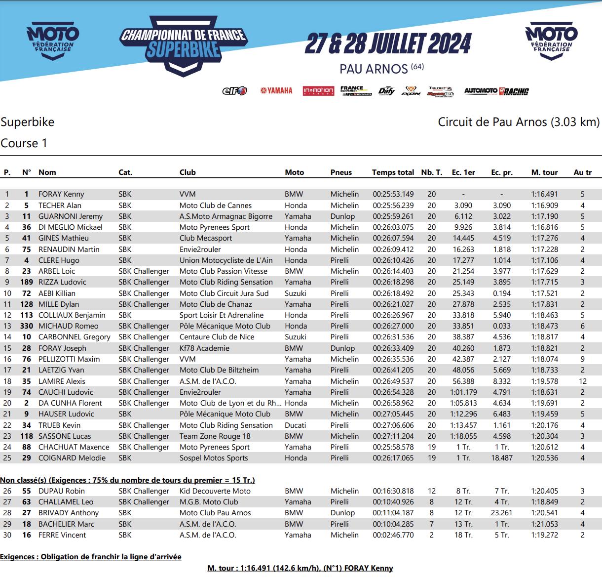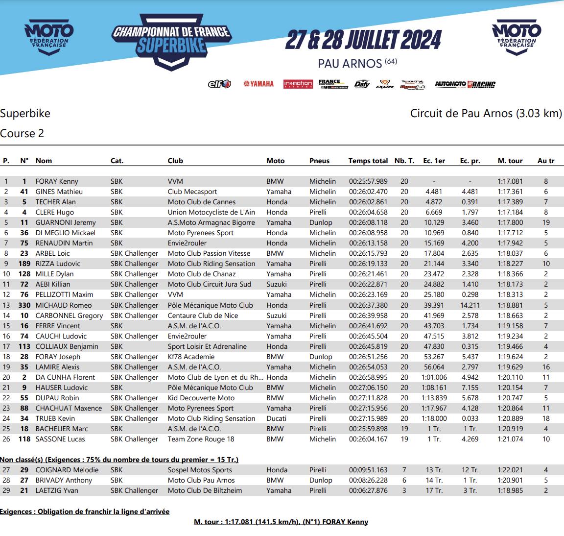 À l’arrivée FORAY conforte sa place de leader en remportant sa 5ème course depuis le début de saison. Sur la seconde marche nous retrouvons Mathieu GINES, malchanceux ici même l’année passée. Enfin la 3ème marche est occupée par Alan TECHER. Au pied du podium, Hugo CLERE devance Jérémy GUARNONI, 5ème, Mike DI MEGLIO, 6ème et Martin RENAUDIN, 7ème. Loic ARBEL conclut à la 8ème place, premier Challenger. À ses côtés sur le podium de cette catégorie jeune Ludovic RIZZA (Yamaha – Pirelli), 9ème et Dylan  MILLE (Team PMR Yamaha – Pirelli), 10ème.