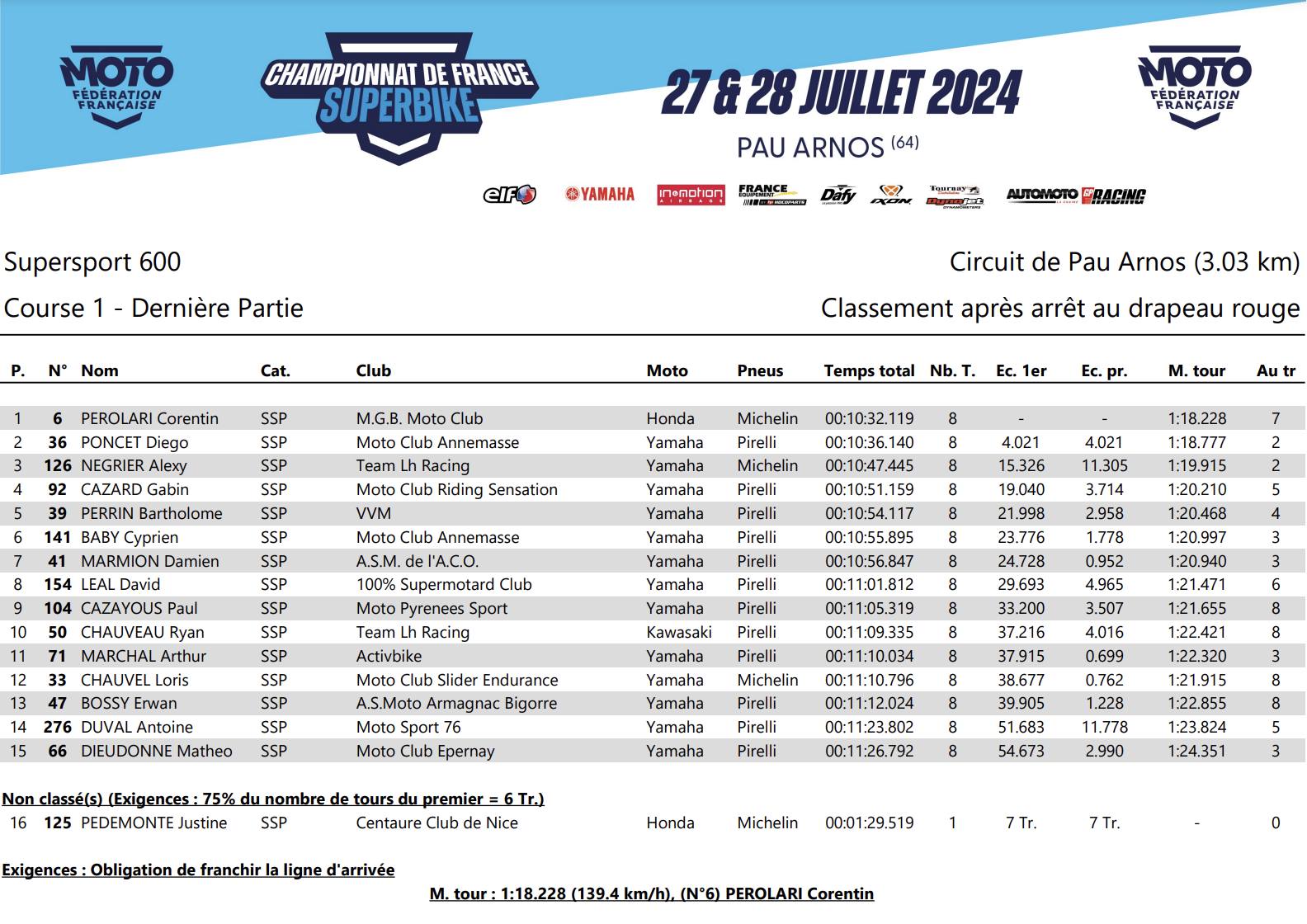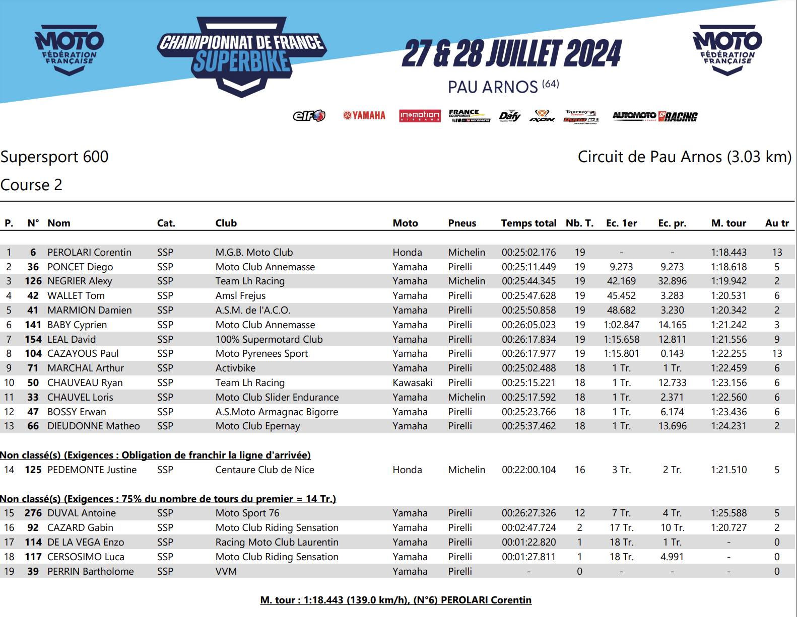 À l’arrivée, Corentin PEROLARI s’impose logiquement pour la deuxième fois du week-end. Sur la seconde marche du podium, on retrouve Diego PONCET et Alexy NEGRIER monte sur la 3ème marche. Le jeune Manceau de 17 ans remporte ainsi la Wild Card en WSBK offerte par la Fédération Française de Motocyclisme au leader du Championnat provisoire (hors pilotes officiels). C’est finalement Tom WALLET qui s’empare de la 4ème place devant Damien MARMION, 5ème.