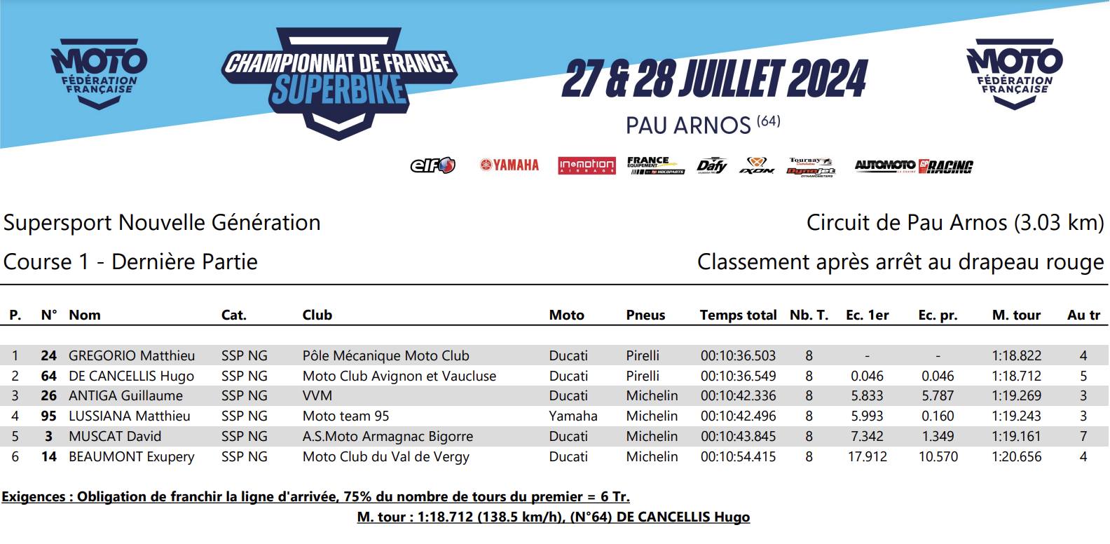 Le meilleur départ est celui de Matthieu GREGORIO (Ducati – Pirelli) qui file en tête à la fin du premier tour. Il devance d’une courte tête Hugo DE CANCELLIS (Ducati – Pirelli), second et à l’affût de la moindre ouverture. Plus distancé, Guillaume ANTIGA (Ducati – Michelin) est troisième et challengé par Matthieu LUSSIANA (Yamaha – Michelin), 4ème.