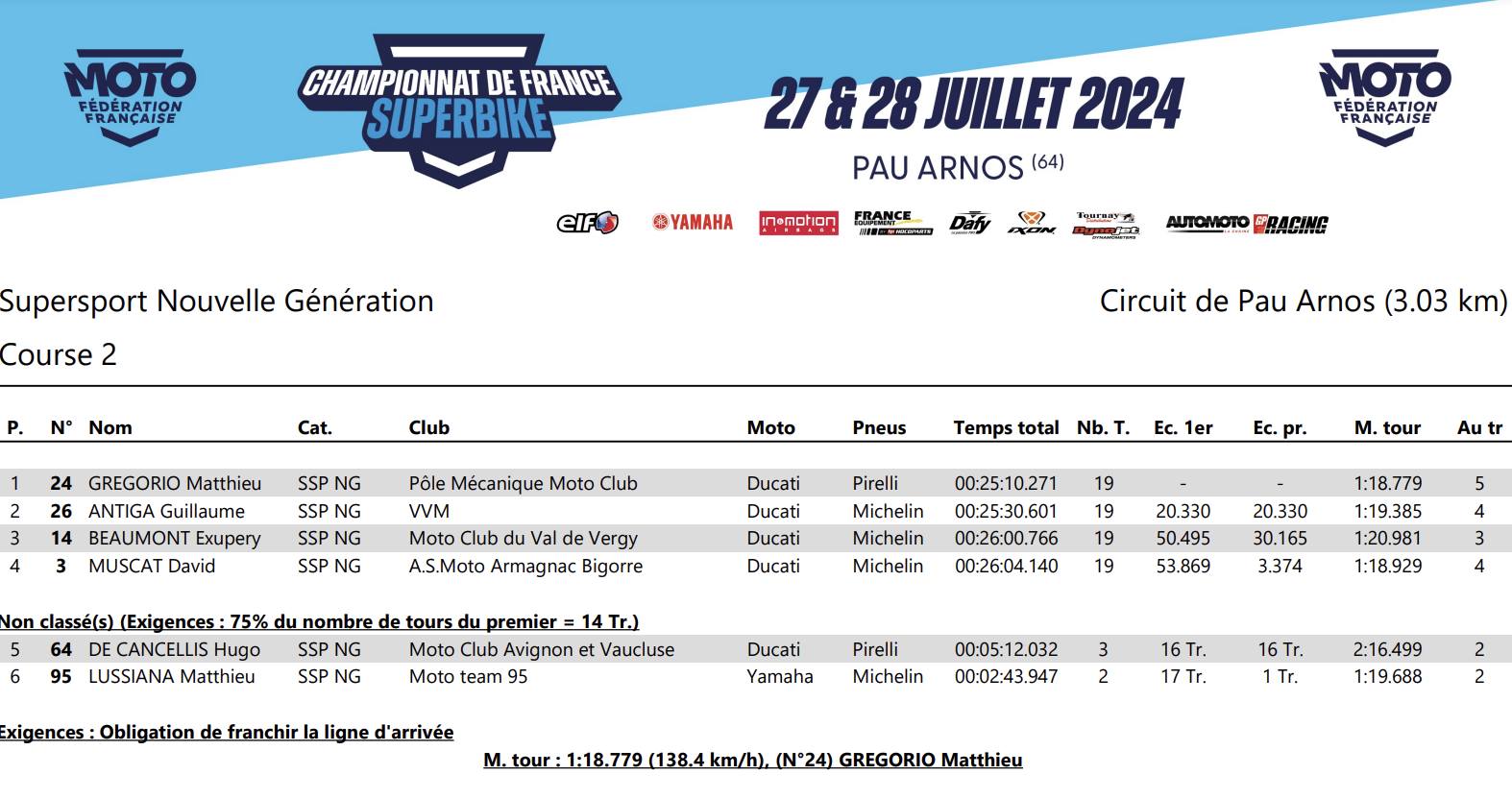 À l ‘arrivée, pas de surprise, Matthieu GREGORIO l’emporte pour la troisième fois de la saison. Il conforte ainsi sa place de leader de la catégorie Nouvelle Génération. Sur la seconde marche, Hugo DE CANCELLIS devance Guillaume ANTIGA qui remonte sur le podium, 3ème.