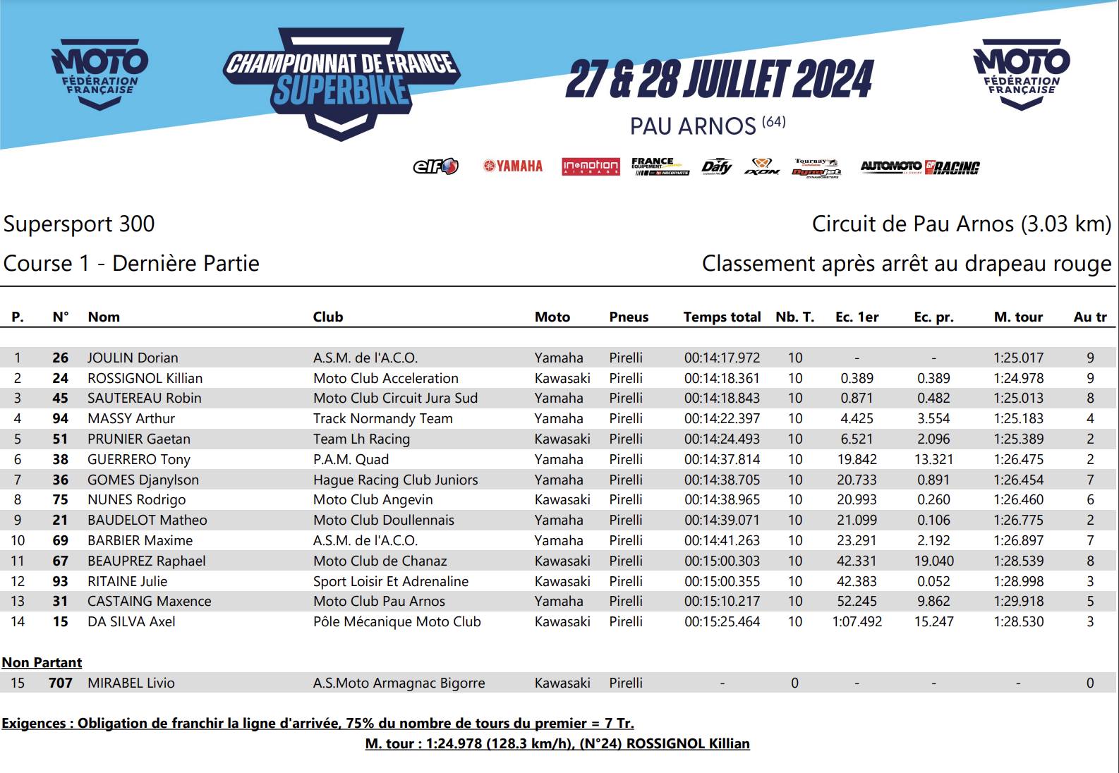 Second départ pour 10 tours et le scénario reste le même. Dorian JOULIN file en tête à la fin du premier tour et devance Killian ROSSIGNOL, second et au contact, tout comme Gaëtan PRUNIER (Kawasaki – Pirelli), 3ème. Plus distancés Robin SAUTEREAU (Yamaha – Pirelli) et Arthur MASSY (Yamaha – Pirelli) sont à la lutte et complètent le top 5.