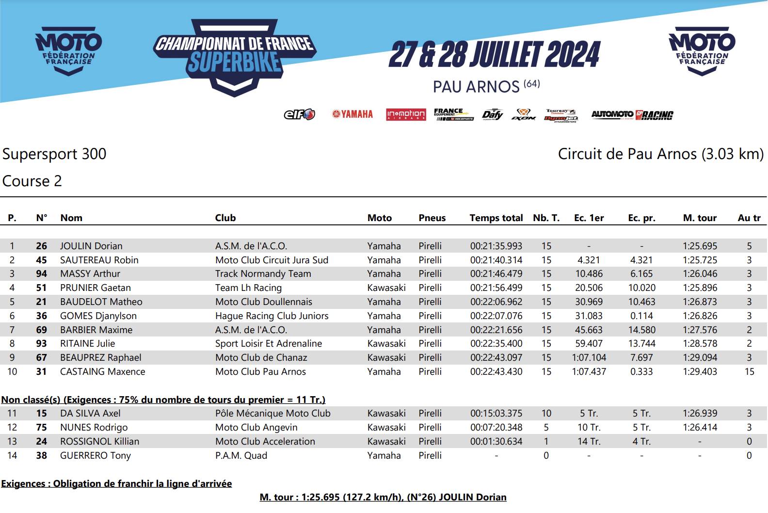 À l’arrivée, Dorian JOULIN l’emporte logiquement avec plus de 4 secondes d’avance sur le second. Il s’agit de Robin SAUTEREAU, qui monte pour la 4ème fois de la saison sur le podium. Arthur MASSY s’empare de la troisième place et prend des points importants dans lutte au titre. Le top 5 est complété par Gaëtan PRUNIER, 4ème et Djanylson GOMES, 5ème.