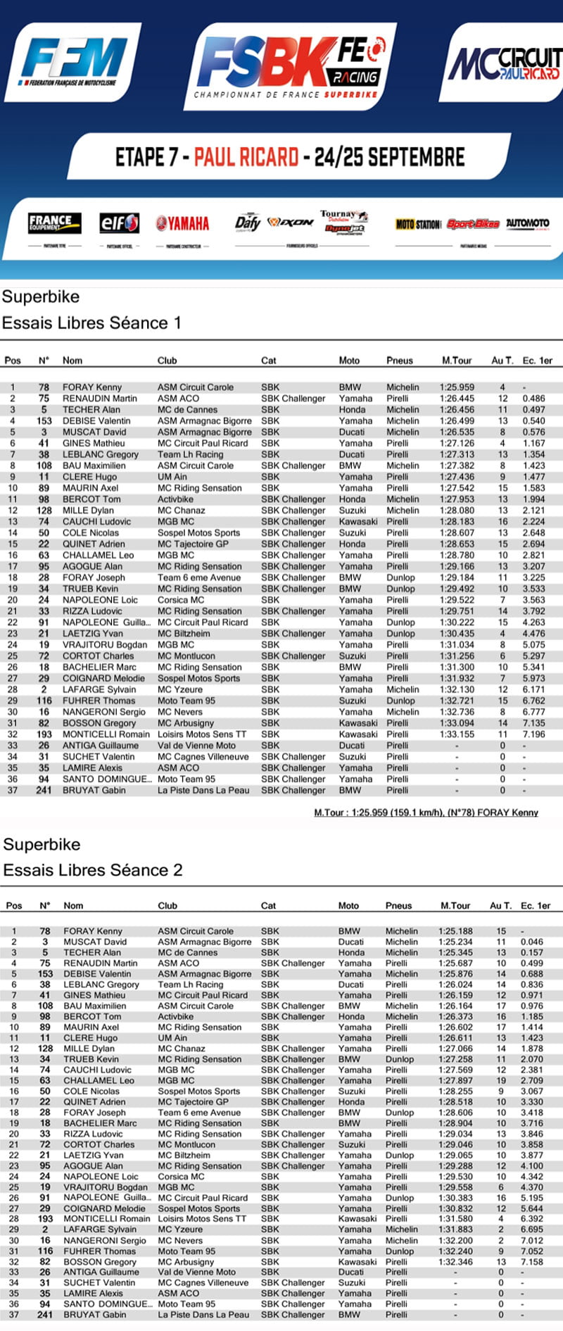 Lors des premiers essais libres disputés vendredi, c’est Kenny Foray qui s’est montré le plus rapide lors des deux séances, 46 millièmes devant l’inoxydable David Muscat (Ducati) l’après-midi.