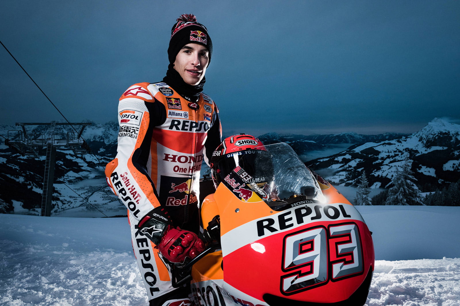 C’est le cas aujourd’hui avec cette galerie de photos de Marc Marquez et sa Honda RC213V sur la neige en Autriche, pour une expérience joliment illustrée par les photographe Red Bull, dont on peut clairement louer la qualité.
