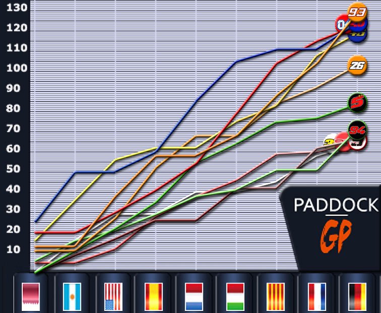 Le top 5 est fermement tenu par Dani Pedrosa, à la victoire unique, qui est à 26 points, tandis que les deux places suivantes reviennent au duo de chez Tech3. Johann Zarco a récolté jusque-là 84 points et Jonas Folger 71.