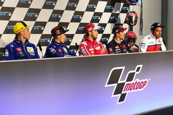 En ce très humide après-midi du jeudi, la traditionnelle conférence de presse recevait à la veille des essais du Grand Prix d’Allemagne, neuvième course de la saison, Andrea Dovizioso, Maverick Vinales, Marc Marquez, Valentino Rossi, Danilo Petrucci et Jonas Folger