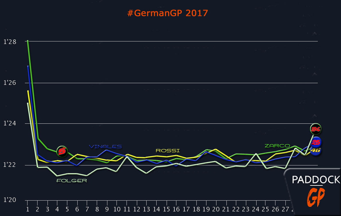 Comme la courbe du vainqueur de ce Grand Prix d’Allemagne, Marc Márquez, est relativement limpide, intéressons-nous aujourd’hui aux différents choix effectués par les pilotes Yamaha afin de tenter de pallier à leur relative mauvaise qualification.