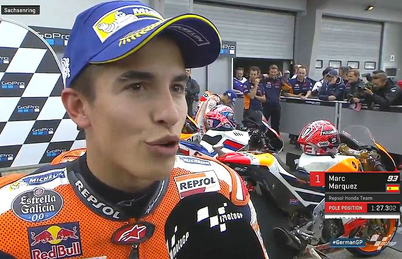 A peine descendu de sa Honda RC 213 V officielle, c’est un Marc Márquez visiblement heureux d’avoir pu maintenir sa domination à l’issue des qualifications sur le circuit allemand, y compris sur le mouillé, qui s’est exprimé au micro du site MotoGP.com.