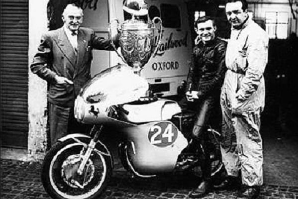 Il fut un temps où Ducati était déjà présent en 250, comme sur la photo ci-dessus qui représente Mike Hailwood en1960, avec à gauche son père Stan, et à droite Oscar Folesani, mécanicien détaché par l’usine Ducati pout assister Mike the Bike. La moto est la 250 bicylindre (55,25 x 40 mm) à distribution desmodromique spécialement réalisée par Taglioni.