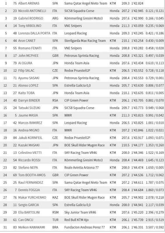 Andrea Migno s’emparait du meilleur temps en 1’43.846, devant Fenati désormais en 1’43.959. A 25 minutes du drapeau à damier, Albert Arenas passait en 1’43.639, bientôt battu par Kaito Toba en 1’43.635. Le temps d’Arenas était annulé pour avoir excédé les limites de la piste.