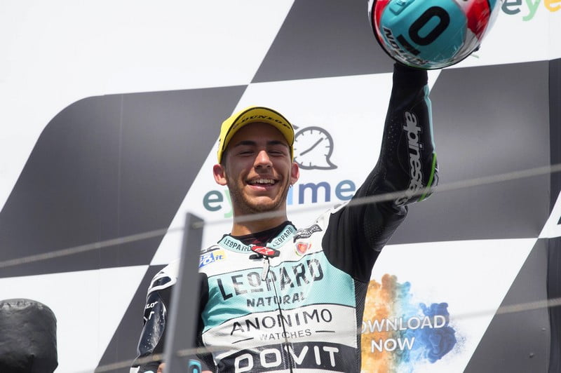 « La course a vraiment été dure et j’ai pris un mauvais départ. Je vais devoir travailler sur ce point. Au début j’ai dû m’habituer à une modification du frein moteur et cela n’était pas simple de dépasser ceux devant moi. Une fois que j’ai trouvé le bon feeling avec la moto (qui était parfaite), je suis parvenu à imprimer mon rythme et à faire d’excellents temps qui m’ont permis de remonter sur le groupe de tête et d’y doubler les pilotes. Je suis à quarante-et-un points de Marco [Bezzecchi] au Championnat, mais dans notre catégorie tout peut arriver. A présent cela sera important de rester concentrés et de tout tenter jusqu’à la fin. »