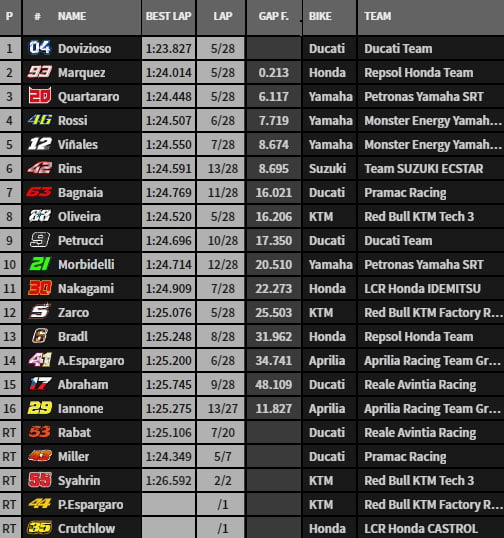 Le meilleur des KTM est Oliveira qui pointe en neuvième position. Zarco est douzième. A noter la contre performance de Petrucci qui n’est que dixième. Encore 12 tours avant le passage du drapeau à damiers et devant, Márquez contrôle la course devant Dovizioso et Quartararo. Le tricolore a 1,5s d’avance sur Rossi qui est quatrième.Viñales et Rins sont cinquième et sixième. A noter, la huitième place d’Oliveira qui a dépassé l’officiel Ducati, Petrucci.
