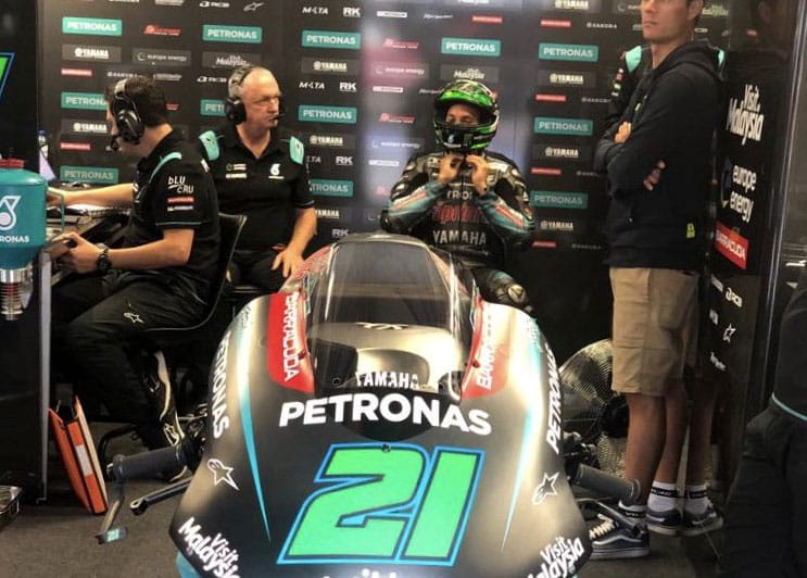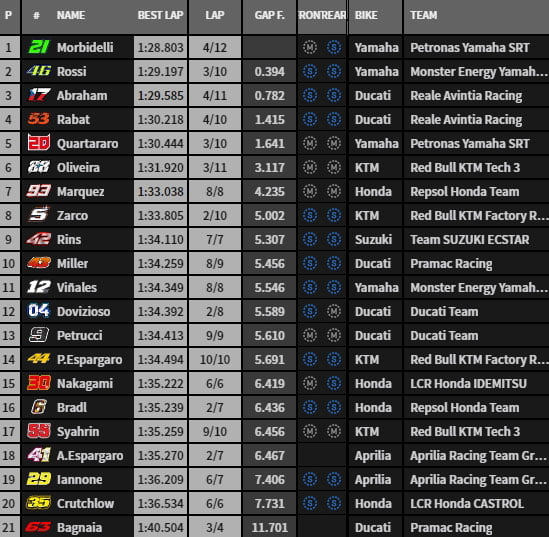 À cet instant, une dizaine de pilotes (dont Marc Márquez, Maverick Viñales, Álex Rins, Cal Crutchlow, Pol Espargaró) n’ont pas encore inscrit de chronos, puisque retournés dans leur box après un tour de reconnaissance.