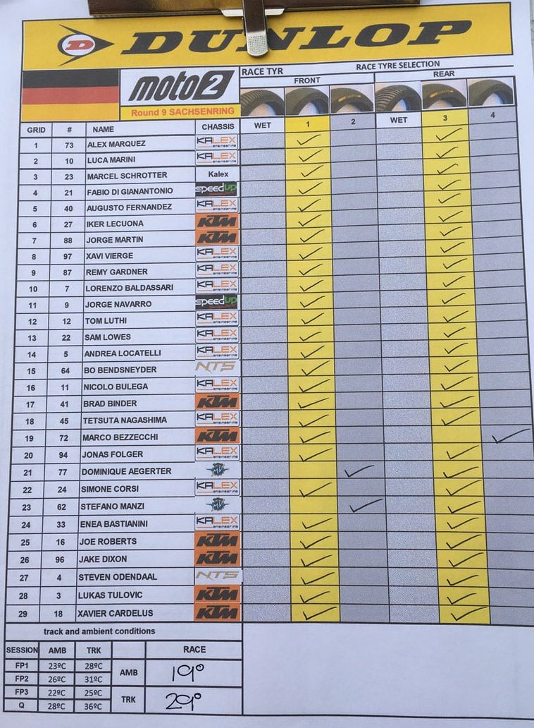 La première ligne, complétée par Luca Marini (Kalex, SKY Racing Team VR46) et le local Marcel Schrötter (Kalex, Dynavolt Intact GP), se tient en moins d’un dixième de seconde, ce qui augure d’une course de 28 tours très animée pour cette neuvième manche de la saison en Allemagne.