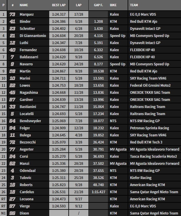 Au championnat, Álex Márquez reprend le commandement avec 136 points devant Tom Lüthi (128), Augusto Fernández (102) et Lorenzo Baldassarri (97).
