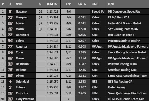 Lowes passe en 1’23 et se rapproche du record de Pasini datant de l’an passé. Navarro réalise l’exploit en 1’23.426 avec sa Speed Up. Il met une demi-seconde à Lowes. Marini et Álex Márquez complètent le top 4 provisoire. Bezzecchi est le premier éliminé sur la KTM Tech3.