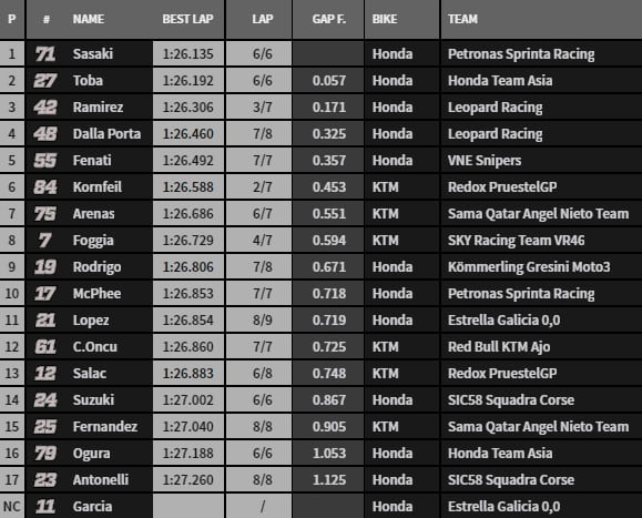 Ayumu Sasaki partira de la première place demain après avoir décroché la toute première pole position de sa carrière en 1’26.135. En seconde position, c’est un autre japonais, Kaito Toba, que nous retrouvons. Pour conclure cette première ligne, Marcos Ramirez s’empare de la troisième place.
