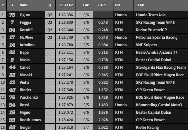 | Q2 | 7 | Dennis FOGGIA | KTM | 1’26.639 | 0.243 | 0.243 |