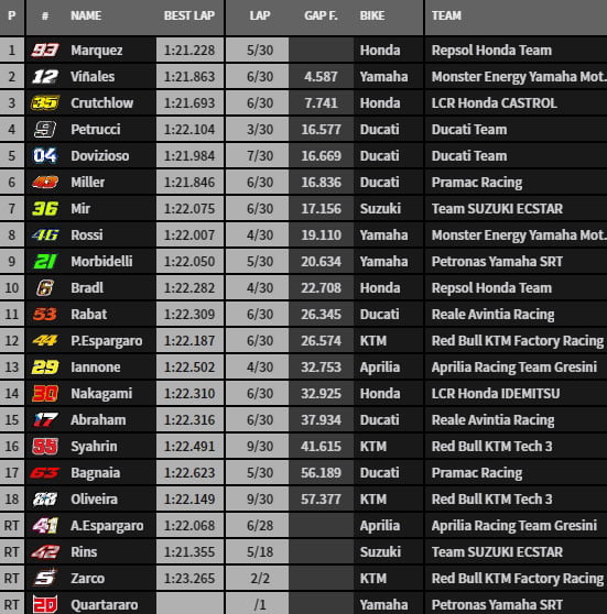 Deux KTM restent en piste et la meilleure est celle de Pol Espargaró 12e. Après trois tours, Márquez, Viñales, Rins et Crutchlow mènent. Miller ferme le top 5. Petrucci en medium hard suit. Dovizioso est septième. Rossi neuvième. Après 5 tours, les Ducati officielles sont déjà à plus de 3s du leader Márquez .
