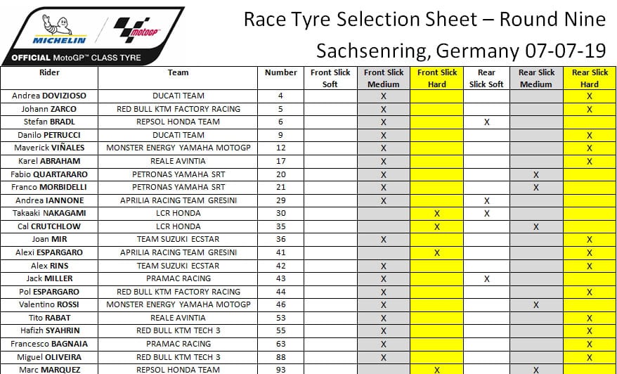 Maverick Viñales, arrivé troisième l’an passé en Allemagne, complète la première ligne. C’est la quatrième fois cette année qu’il l’atteint. Jack Miller hisse la première Ducati en cinquième position.  Cal Crutchlow s’élancera de la sixième place pour la cinquième fois de l’année. D’ailleurs, le Britannique avait signé exactement la même performance en qualifications il y a tout juste une semaine aux Pays-Bas.