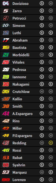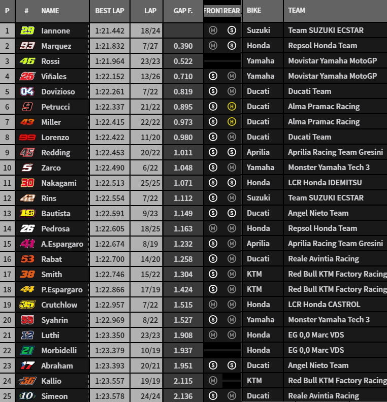 La plupart des pilotes ont choisi une combinaison pneumatique médium arrière / tendre avant, même si on notera que Scott Redding est le seul à utiliser un pneu arrière dur.