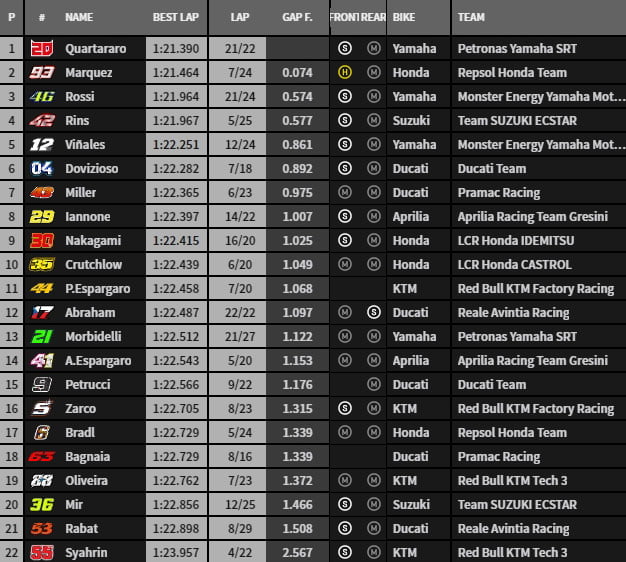 Valentino Rossi fait monter des pneus neufs ce qui lui permet de passer de la 6e à une 2e position qu’il doit ensuite concéder à Fabio Quartararo qui a utilisé la même stratégie, ce que n’ont pas fait la majorité des autres pilotes.