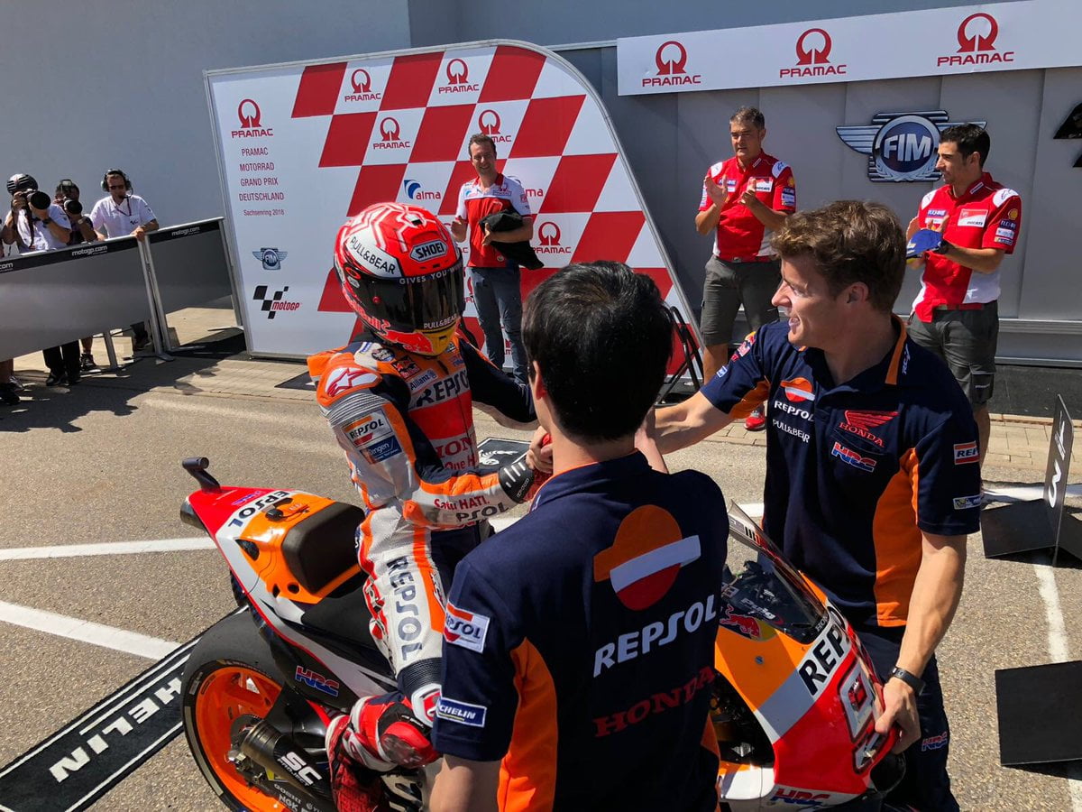 Pour 25 millièmes, Marc Márquez a donc privé Danilo Petrucci de sa première pole position en MotoGP. Ce qui aurait été un exploit sur un terrain dominé depuis huit visites consécutives par l’officiel Honda. Mais ce dernier a prolongé sa maîtrise du Sachsenring pour un an de plus. C’est sa sixième position de pointe consécutive et sa 76ème de carrière. Généralement, en Germanie, ça se termine par une victoire. Mais cette fois, l’équipier du futur retraité Pedrosa sait que ce ne sera pas simple…