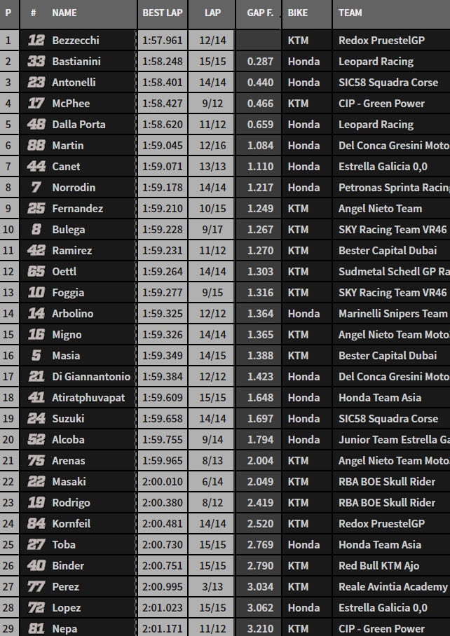 In extremis, Enea Bastianini et Niccolo Antonelli s’intercalent entre Marco Bezzecchi et John Mc Phee.