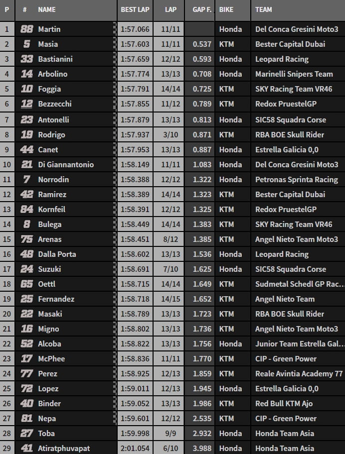 Un peu avant la mi-séance, tous les pilotes rentrent au stand, ce qui permet d’observer la hiérarchie provisoire : Gabriel Rodrigo, 4 dixièmes devant Dennis Foggia (KTM, Sky Racing Team VR46), Jorge Martín (Honda, Del Conca Gresini), Nicolò Bulega (KTM, Sky Racing Team VR46), Niccolò Antonelli (Honda, SIC58 Squadra Corse), Enea Bastianini (Honda, Leopard Racing), Tatsuki Suzuki (Honda, SIC58 Squadra Corse), Tony Arbolino (Honda, Marinelli Snipers Team), Lorenzo Dalla Porta (Honda, Leopard Racing) et Marco Bezzecchi (KTM, PruestlGP) constituant le top 10.