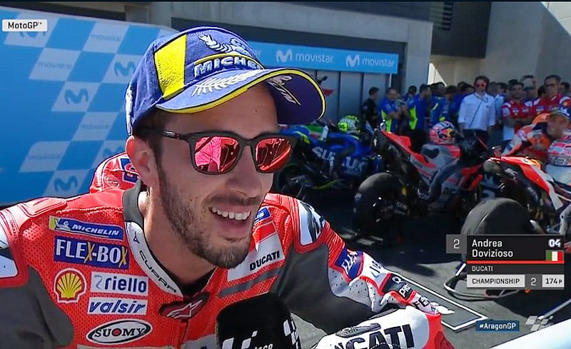 A peine descendu de sa Ducati GP18 officielle après avoir tout donné contre Marc Marquez sans commettre la moindre faute, et obtenu la deuxième marche du podium du Grand Prix d’Aragon, Andrea Dovizioso s’est confié au micro du site officiel MotoGP.com avec une joie certaine mais aussi sans doute le petit regret de ne pas avoir apporté une 4e victoire consécutive à Ducati, ce qui aurait été un moment historique…