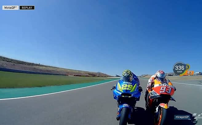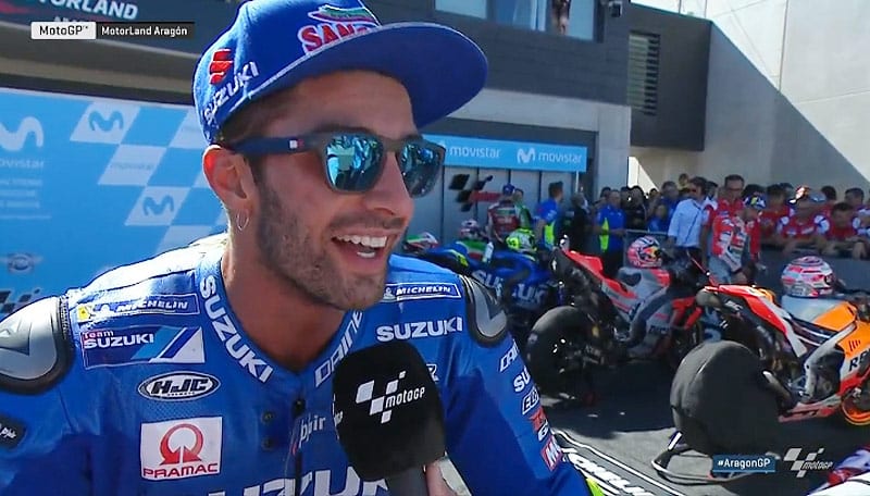 Andrea Iannone : « Oui. Mais bien sûr, si Jorge n’avait pas fait une erreur et avait chuté, cela aurait été un peu plus difficile car il avait un bon rythme. Mais Jorge est parti avec un pneu tendre arrière et je pense que c’était des conditions critiques. Du début jusqu’à la mi-course, je n’ai pas attaqué à mon maximum et je pense que c’était une très bonne stratégie. À la fin, j’avais quelques dixièmes de plus par rapport à Alex et j’ai pu suivre Dovi et Marc. Obtenir ce podium est très bon pour moi, pour nous, et nous avons très bien travaillé durant ce week-end. Merci à Suzuki et à toutes les personnes qui travaillent avec moi ».
